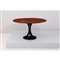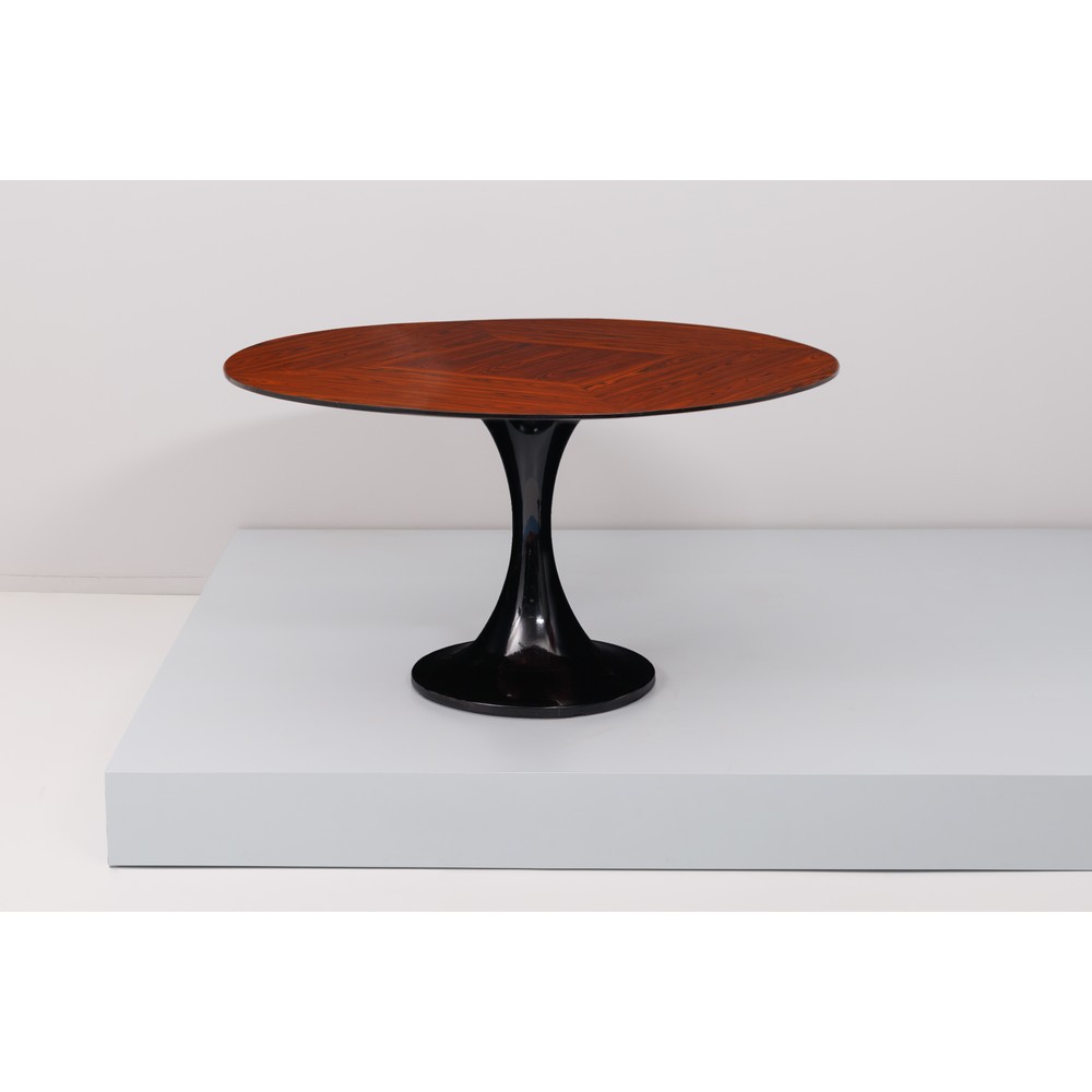 Tavolo rotondo modello ‘Clessidra’ in legno con piano impiallacciato, piede verniciato nero.