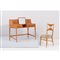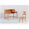 Una scrivania in legno di ciliegio, piano rettangolare con due cassetti ed un vano a giorno, piano superiore inclinato con quattro cassetti e vano a giorno, sedia in legno di ciliegio, spalliera ad impianto geometrico curvo, seduta rivestita in tessuto a decoro kilim. Restaurate.