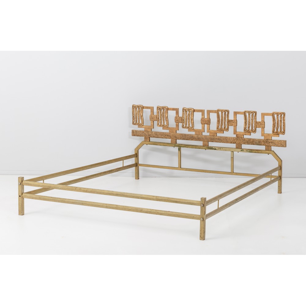 Letto con struttura in ottone, testata a motivi geometrici a lavorazione martellata e liscia in ottone.