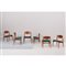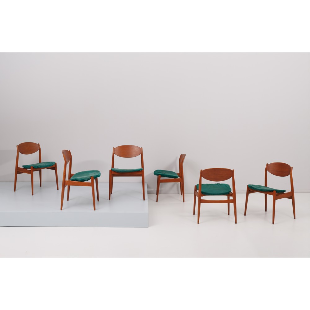 Sei sedie in legno di teak, spalliera ovalizzata, seduta rivestita in tessuto verde. Etichetta di produzione.