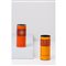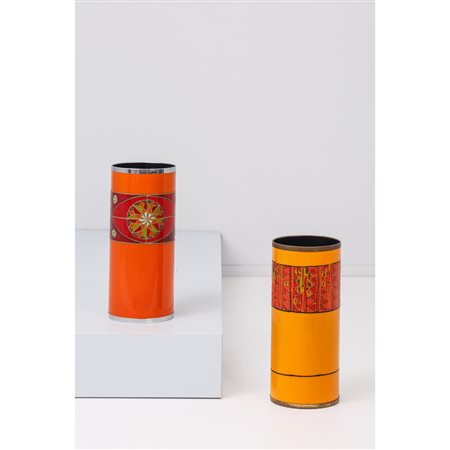 Due porta ombrelli cilindrici in metallo smaltato con decorazioni geometriche giallo e rosso.