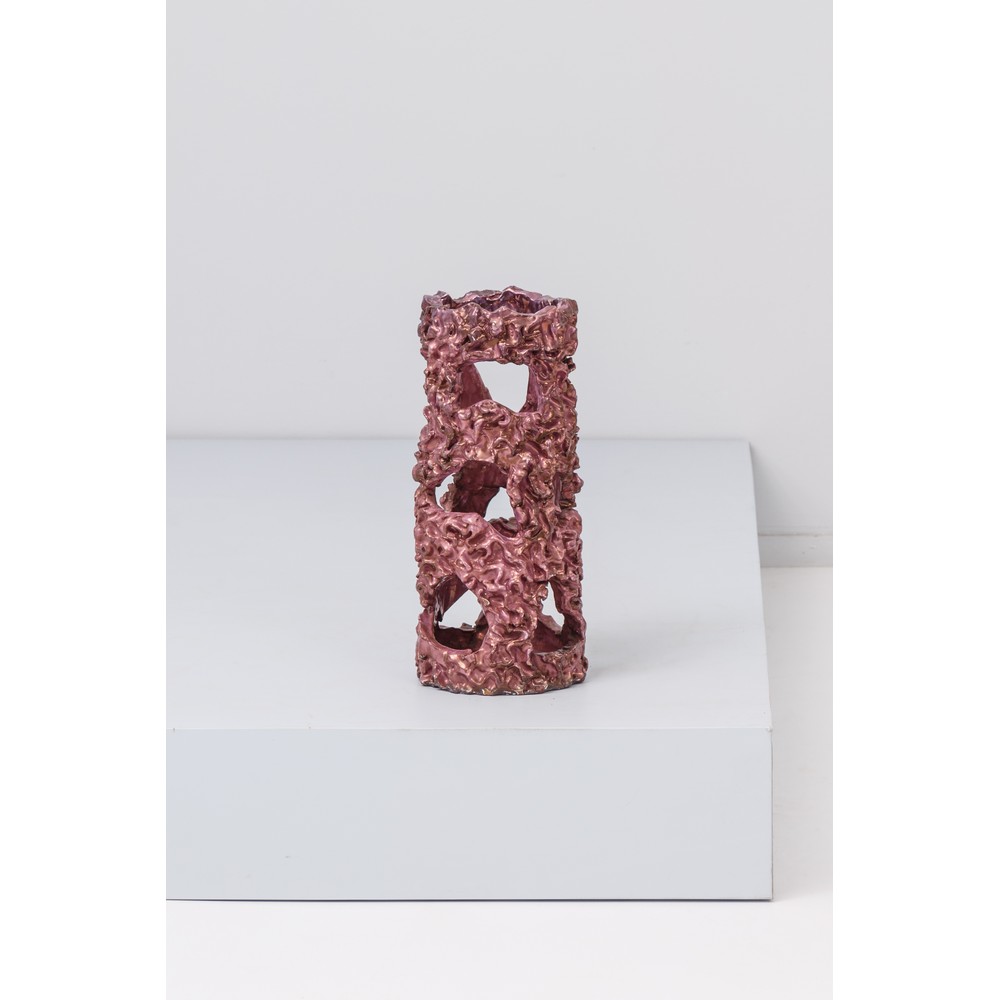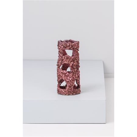 Portaombrelli cilindrico in ceramica smaltata lilla, all'interno è presente un'etichetta e una sigla sul fondo, non identificata.
