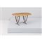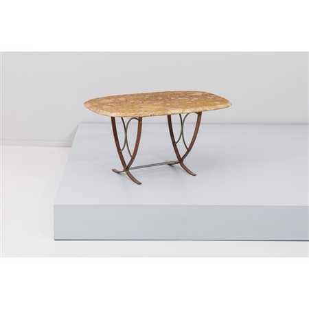 Tavolo basso, piano ovalizzato in marmo, piedi a crociera in metallo. Segni del tempo.
