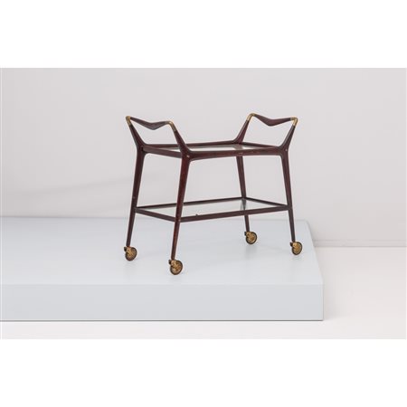 Carrello da servizio modello ‘70’ in legno e ottone, due ripiani in vetro trasparente, ruote in ottone.