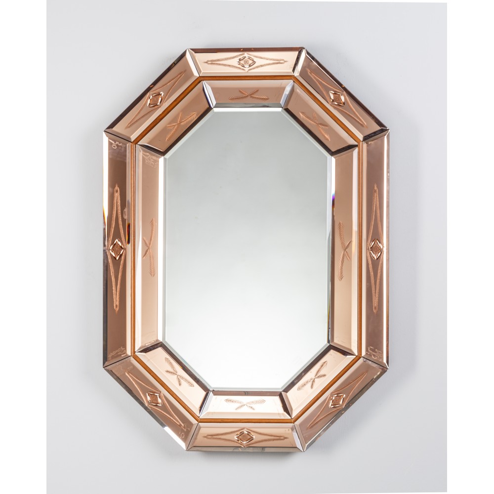 Specchio da parete corpo ottagonale con cornice in vetro specchiato molato e inciso rosa, vetro specchiato.
