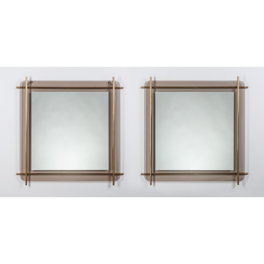 Coppia di specchi da parete, corpo quadrato, cornice in vetro fumè con riquadro di tondini in ottone, vetro specchiato.