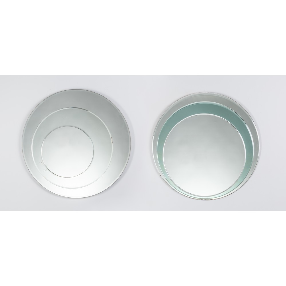 Due specchi da parete, corpo circolare, con elementi in vetro specchiato concentrici, il più grande reca etichetta Rimadesio milano.
