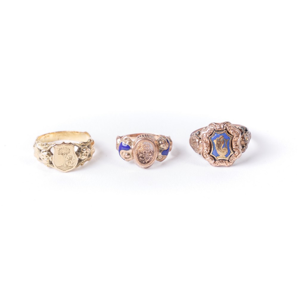 Anello in oro giallo 14 KT con stemma inciso (g. 8,90) e due anelli in oro giallo 9 KT e smalti (g. 5,20) (usure).