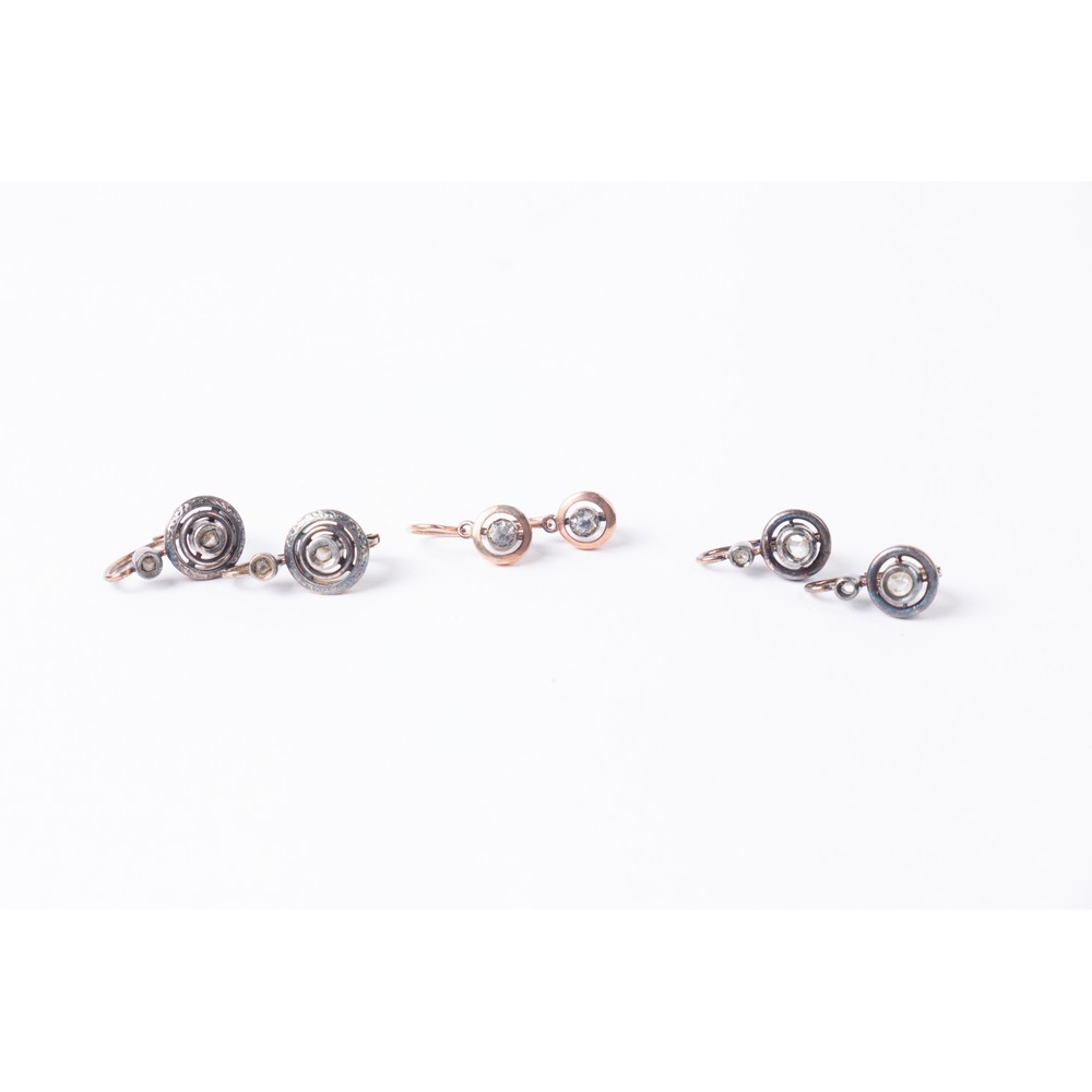 Orecchini in oro giallo 9 KT, orecchini in oro 9 KT e argento con scaglie di diamanti e orecchini in oro 9 KT e argento con scaglie di diamanti (mancanza).