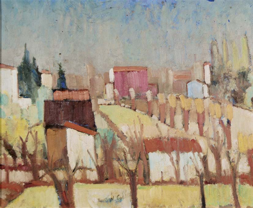 COLETTI NANDO Treviso 1907 - 1979 Fabbriche lungo il Brenta 1952 olio su cartone pressato 40x48 firma in basso al centro, firma data e titolo al retro