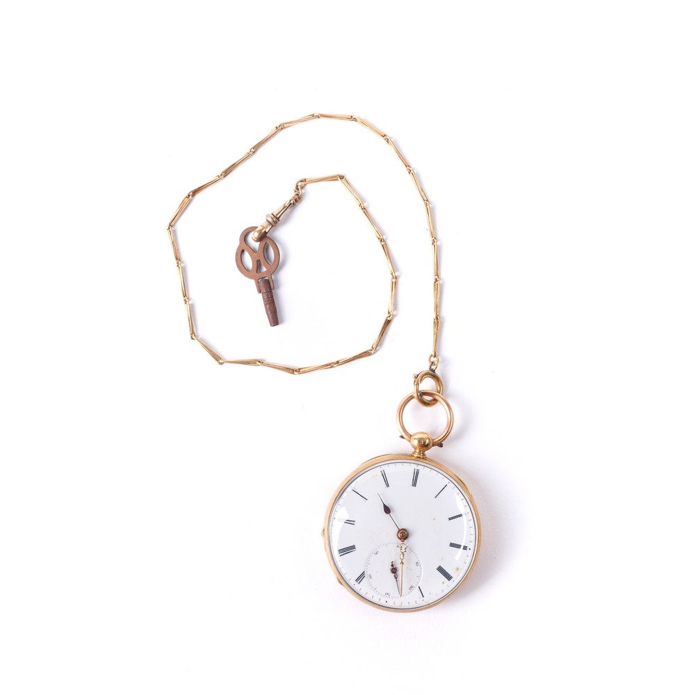 OROLOGIO da tasca con doppia cassa in oro 18 KT con catena in oro 18 KT.