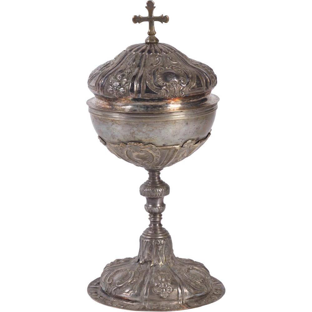 PISSIDE in argento riccamente sbalzato a mano, coppa in argento vermeil (usure) .