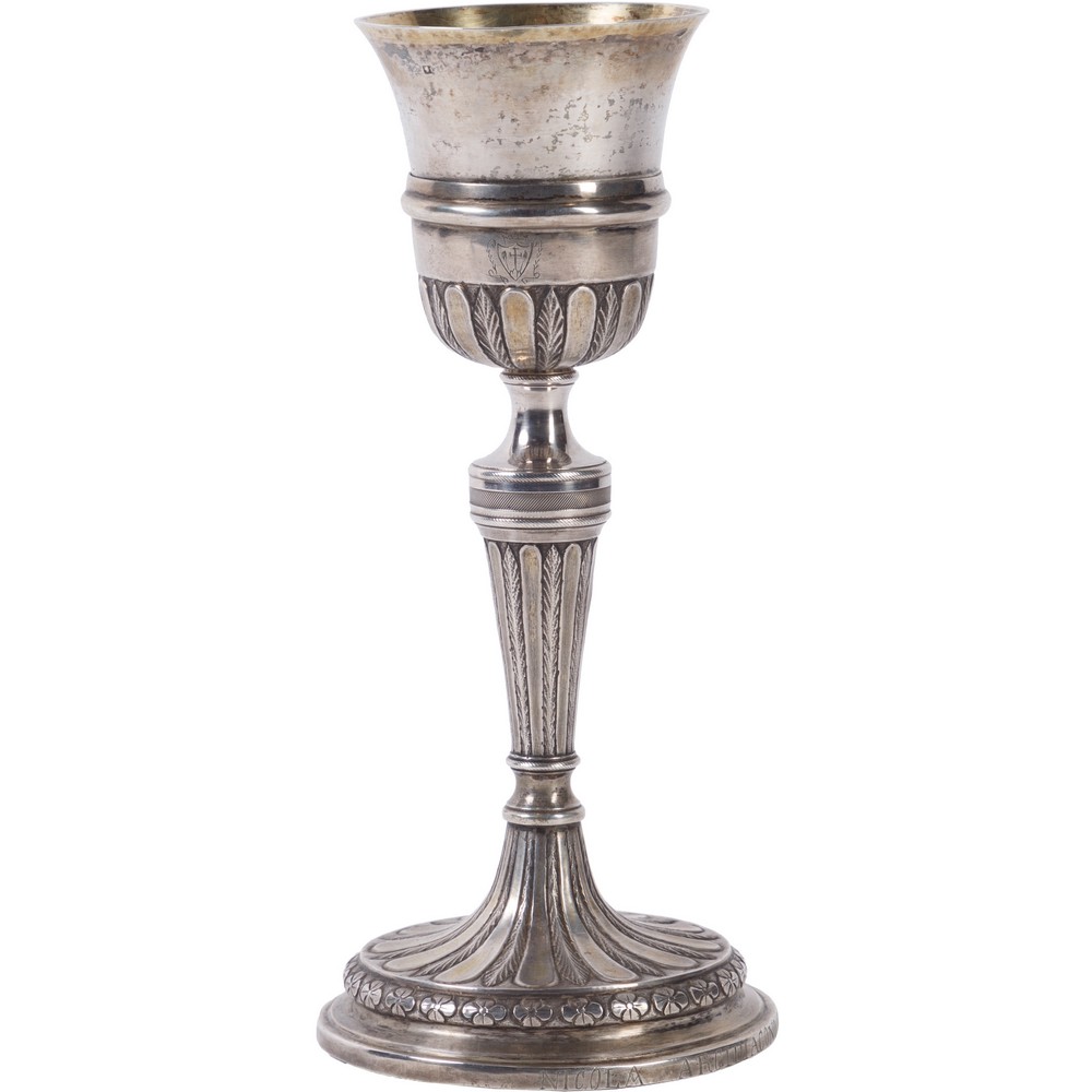 CALICE in argento sbalzato, coppa in argento vermeil. Incisione alla base "Nicola Arcidiacono De Benedictis", stemma sulla coppa.