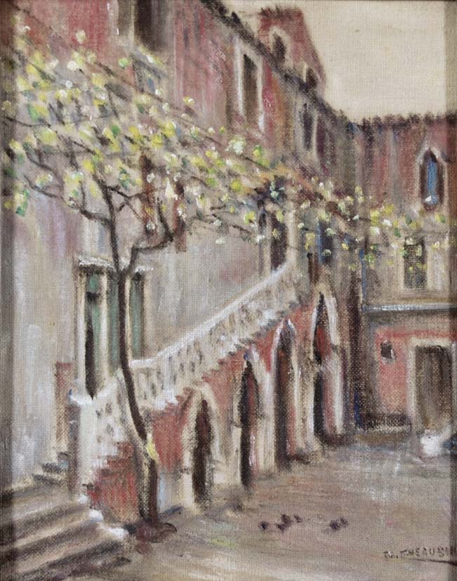 CHERUBINI GIUSEPPE Ancona 1877 - Venezia 1960 Campiello olio su tela riportata su cartone 30x25 firma in basso a destra