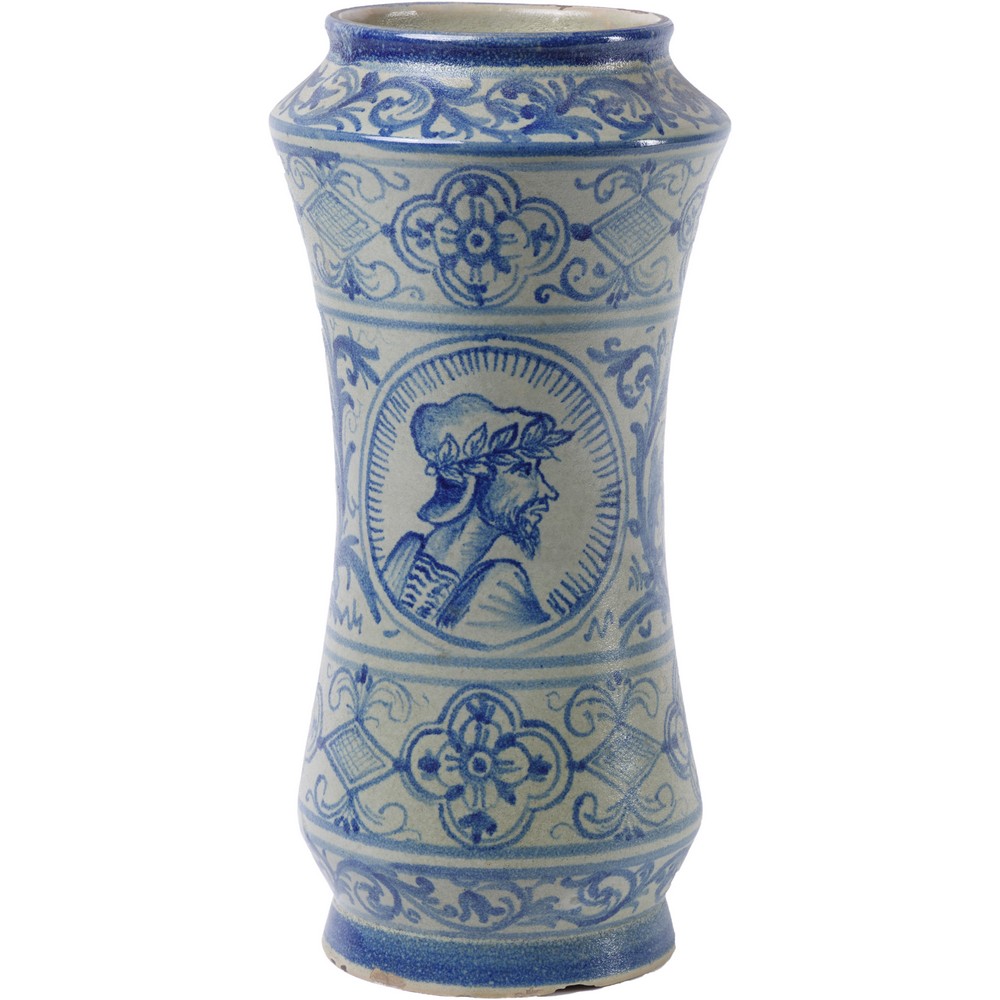 GRANDE ALBARELLO in ceramica smaltata e decorata, con medaglione centrale raffigurante "Mezzobusto maschile".