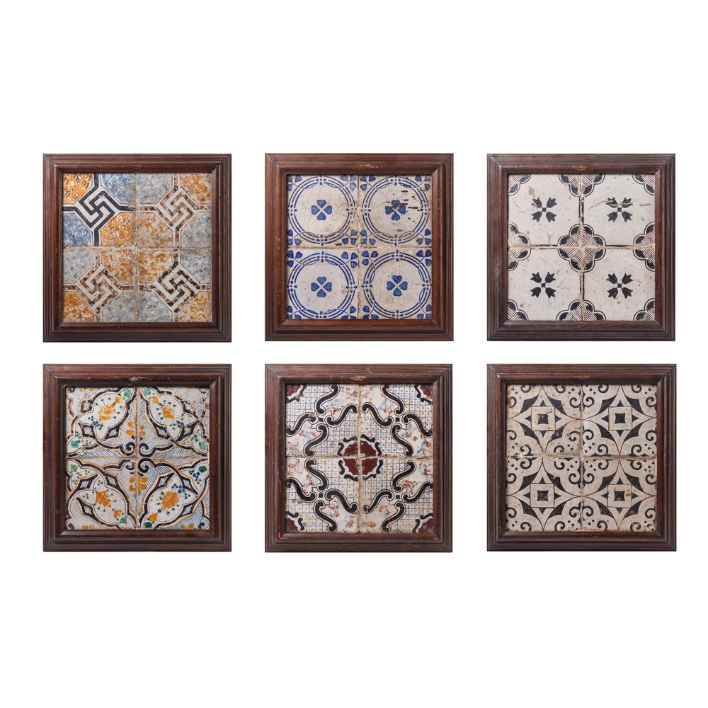 SEI PANNELLI di mattoni decorati e smaltati entro cornice in legno non coeva.