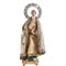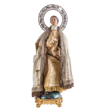 SCULTURA in legno policromo raffigurante "Madonna che schiaccia il serpente”, con stellare in argento, abito in stoffa ricamata a fili d’oro e spillino in oro, base in legno dorata.