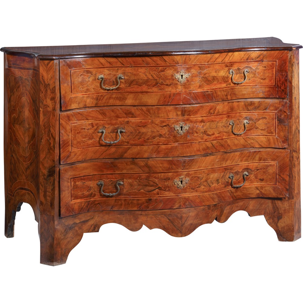 CASSETTONE Luigi XIV a tre cassetti in legno di noce e radica di ulivo.