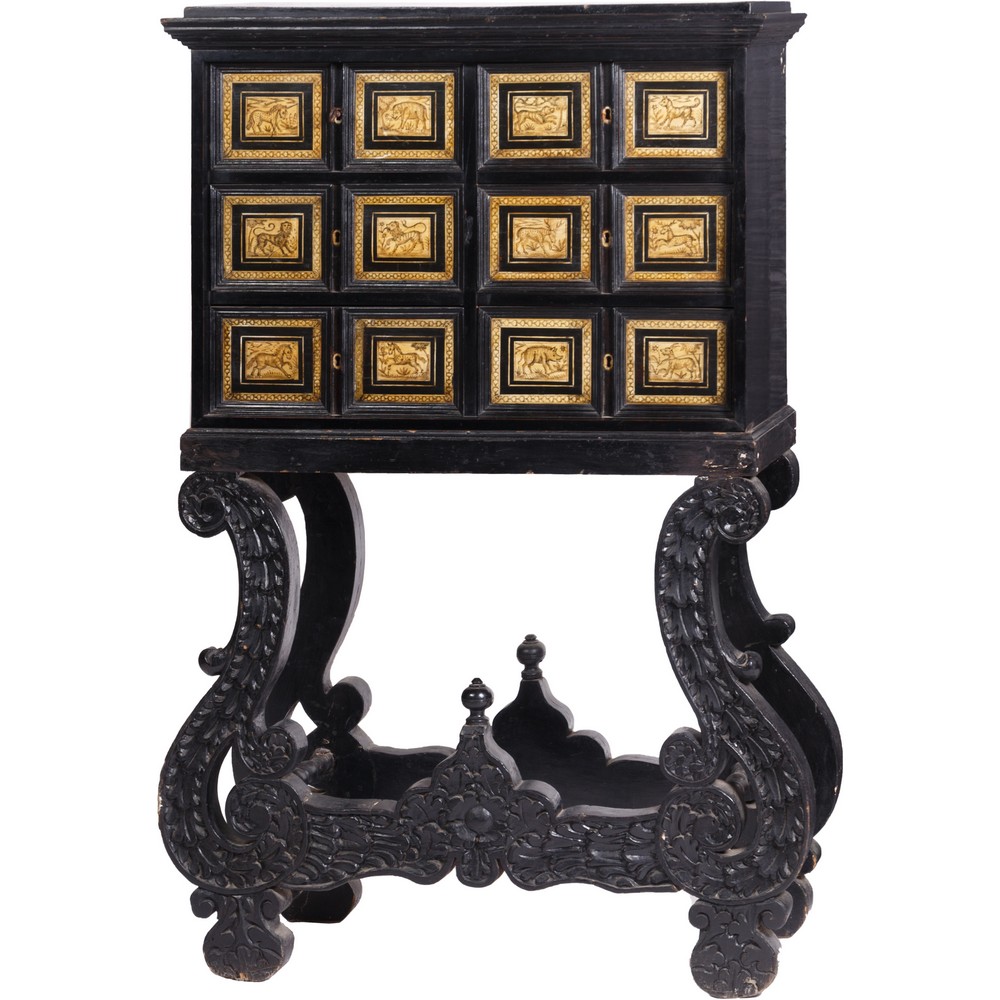 MONETIERE in legno ebanizzato con formelle in avorio raffiguranti “Animali”.