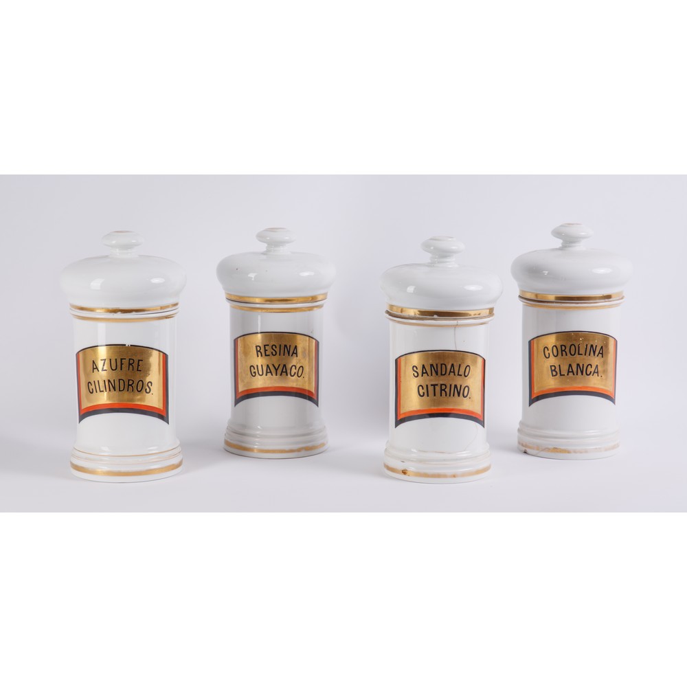 QUATTRO VASI da farmacia in porcellana bianca, lumeggiature in oro.