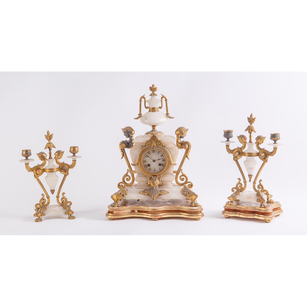 TRITTICO Impero in alabastro e bronzo composto da orologio e due candelabri, basi in legno dorato.