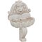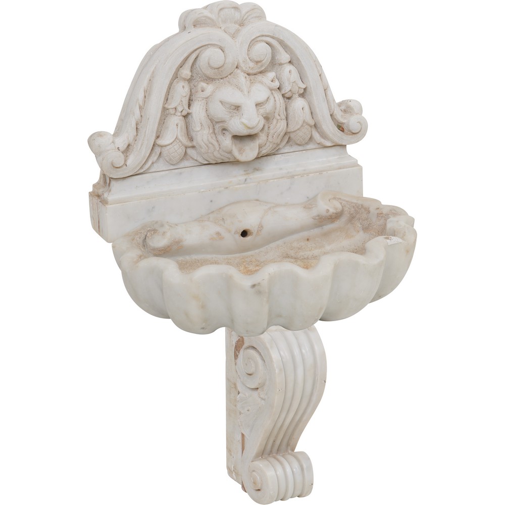 ACQUASANTIERA in marmo bianco a forma di conchiglia con mascherone e mensola.