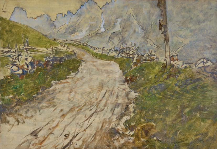 MAZZETTI EMO Treviso 1870 - Venezia 1955 Paesaggio montano olio su tavola 28x40,5 firma al retro Autentica del nipote Elio Mazzetti al retro Provenienza: eredi Mazzetti - timbro al retro