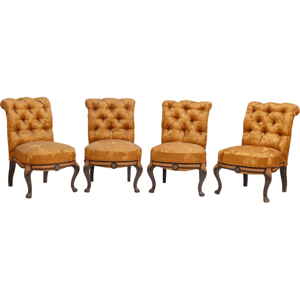 QUATTRO SEDIE da salotto con struttura in legno ebanizzato ed acero, tappezzeria capitonné.