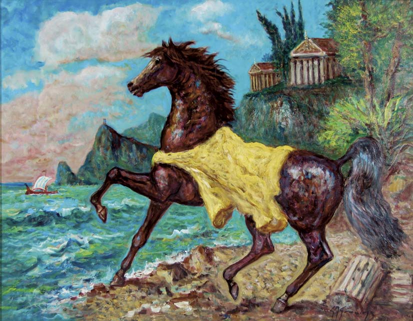 GONZAGA GIOVAN FRANCESCO Milano 1921 - 2007 Il corsiero di Poseidone 1998 olio su tela 70x90 firma e data in basso a destra firma data e titolo al retro Autentica dell'Autore su foto dell' Archivio Fotografico Generale di G. F. Gonzaga nr. AAC 2933 a cura della Galleria d'Arte il Salotto Milano