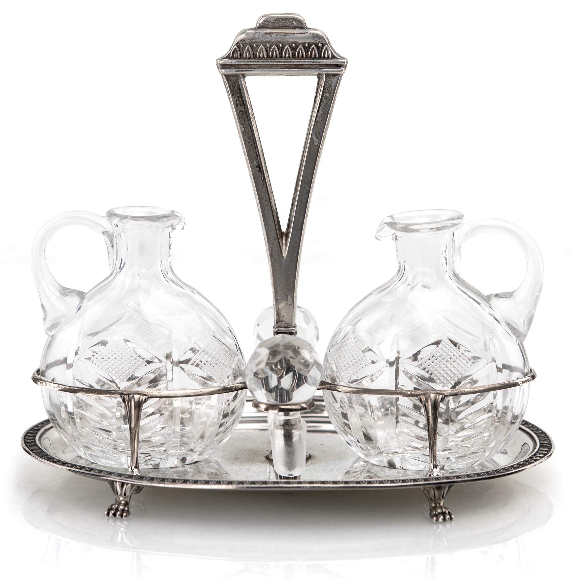 cm 19x21x13 - gr. 255 cm 19x21x13 - gr. 255 di forma ovale con profili cesellati a palmette, sorretta da piedi ferini; presa centrale e due ampolle in cristallo