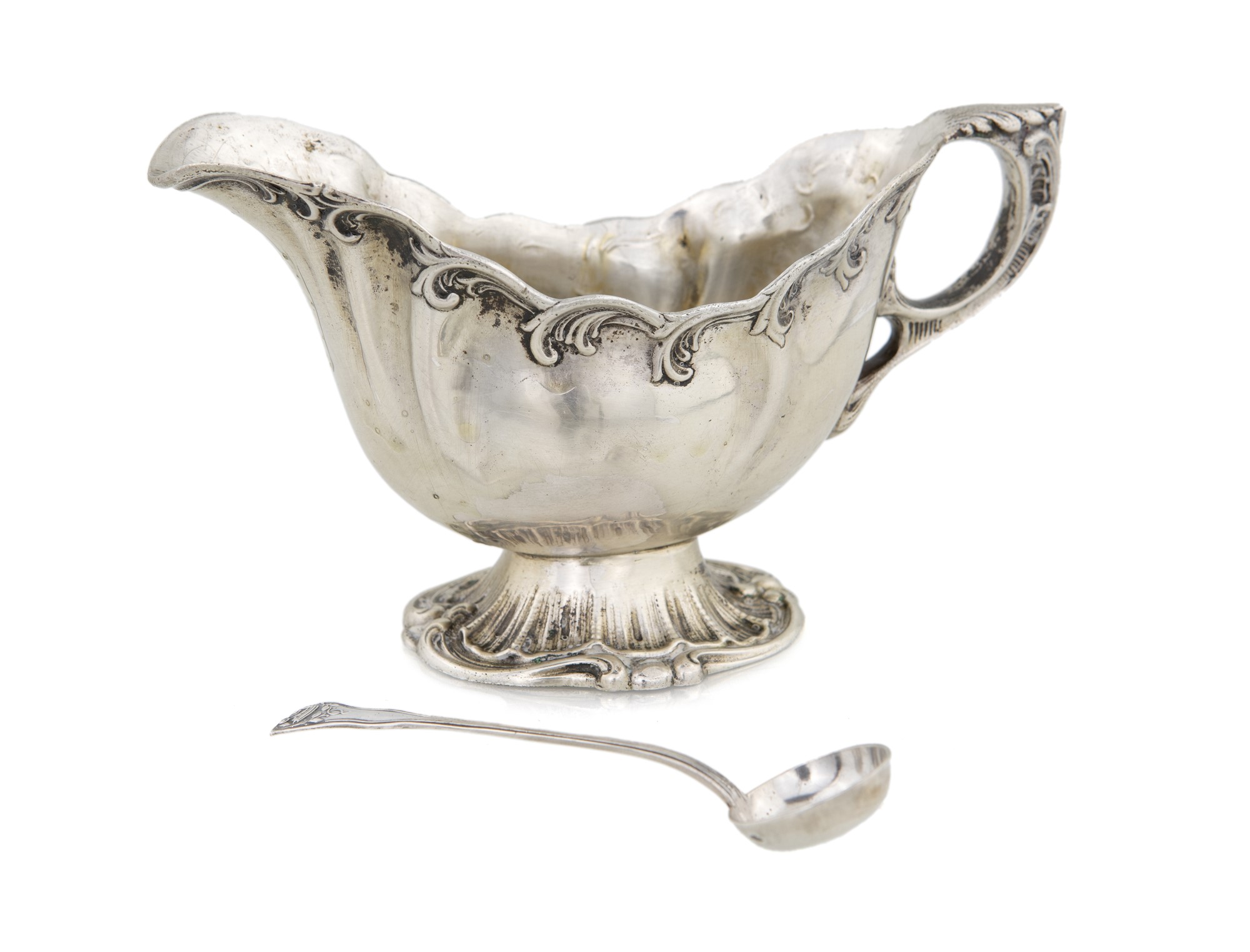 cm 9x16x6,5 - cucchiaino cm 10,5 - gr. 170 cm 9x16x6,5 - cucchiaino cm 10,5 - gr. 170 a forma di navicella con profilo sottolineato da rilievi vegetali; mestolo in argento 950 con bolli francesi della seconda metà del XIX secolo