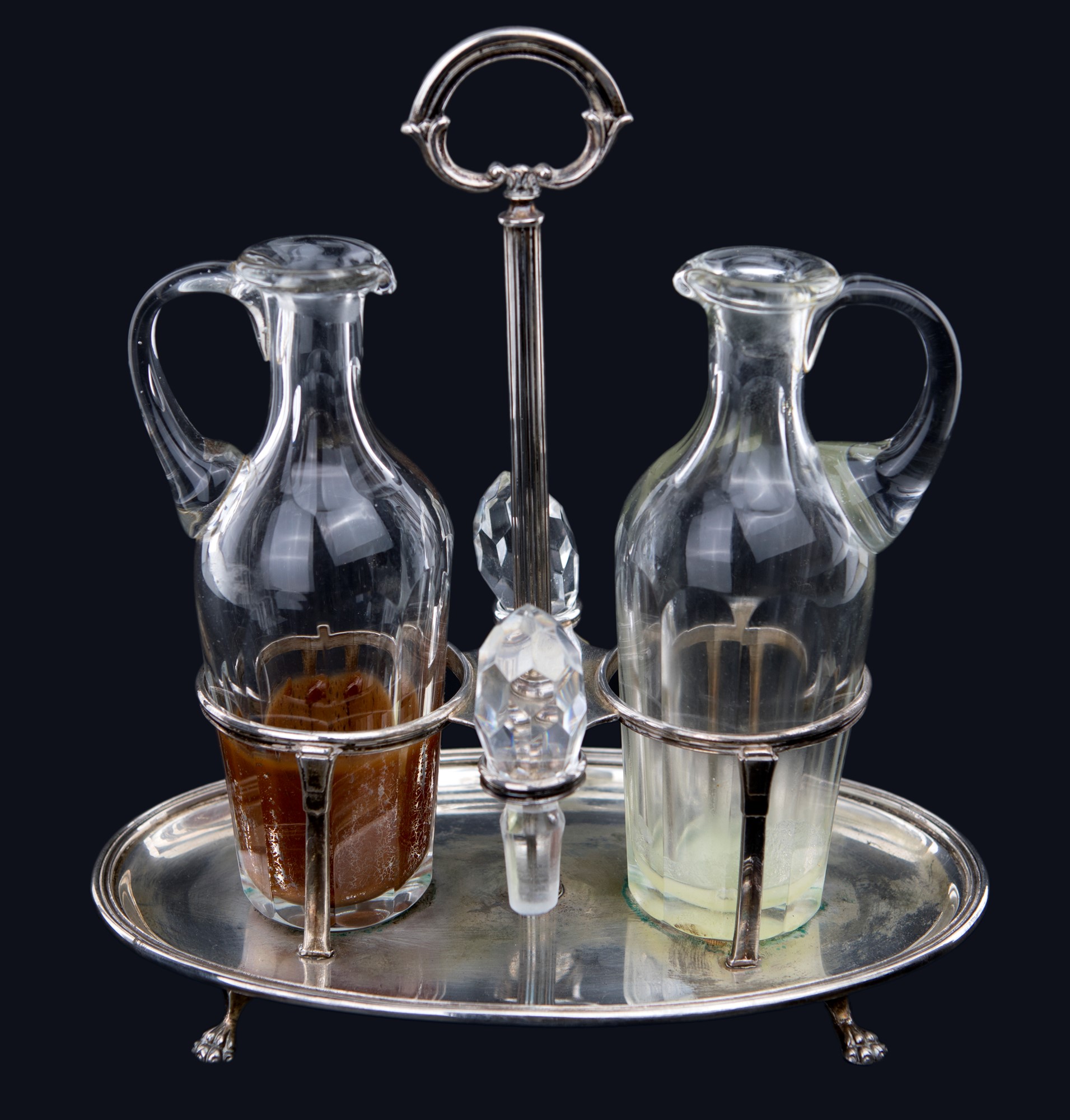 cm 22x21x12 - gr. 348 cm 22x21x12 - gr. 348 con ampolle in cristallo su vassoio ovale sorretto da piedini e presa astile centrale