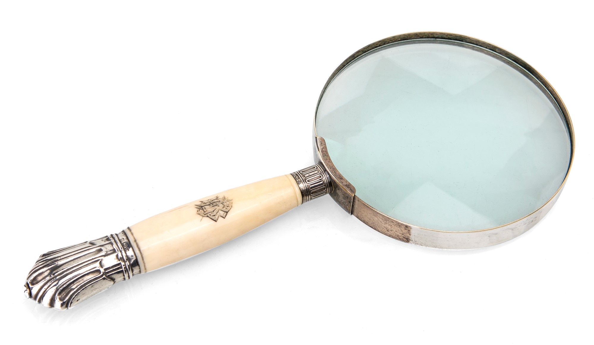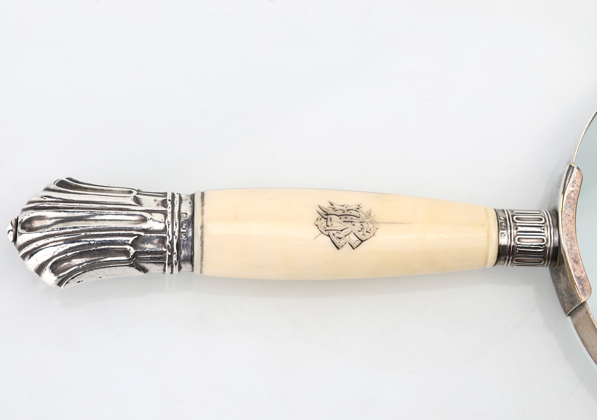 Grande lente da tavolo in argento e avorio, città di Sheffield 1891, argentiere Harry Hobson