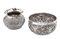 cm 6,5x12 e cm 7x8,5 rispettivamente cm 6,5x12 e cm 7x8,5 rispettivamente in argento a basso titolo con lavorazione sbalzata, il primo a motivi zoomorfi e naturalistici, il secondo di forma sferica con fitta decorazione a volute e fiori con orlo ondulato