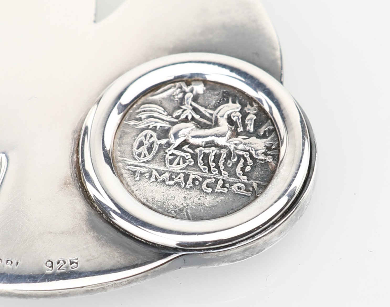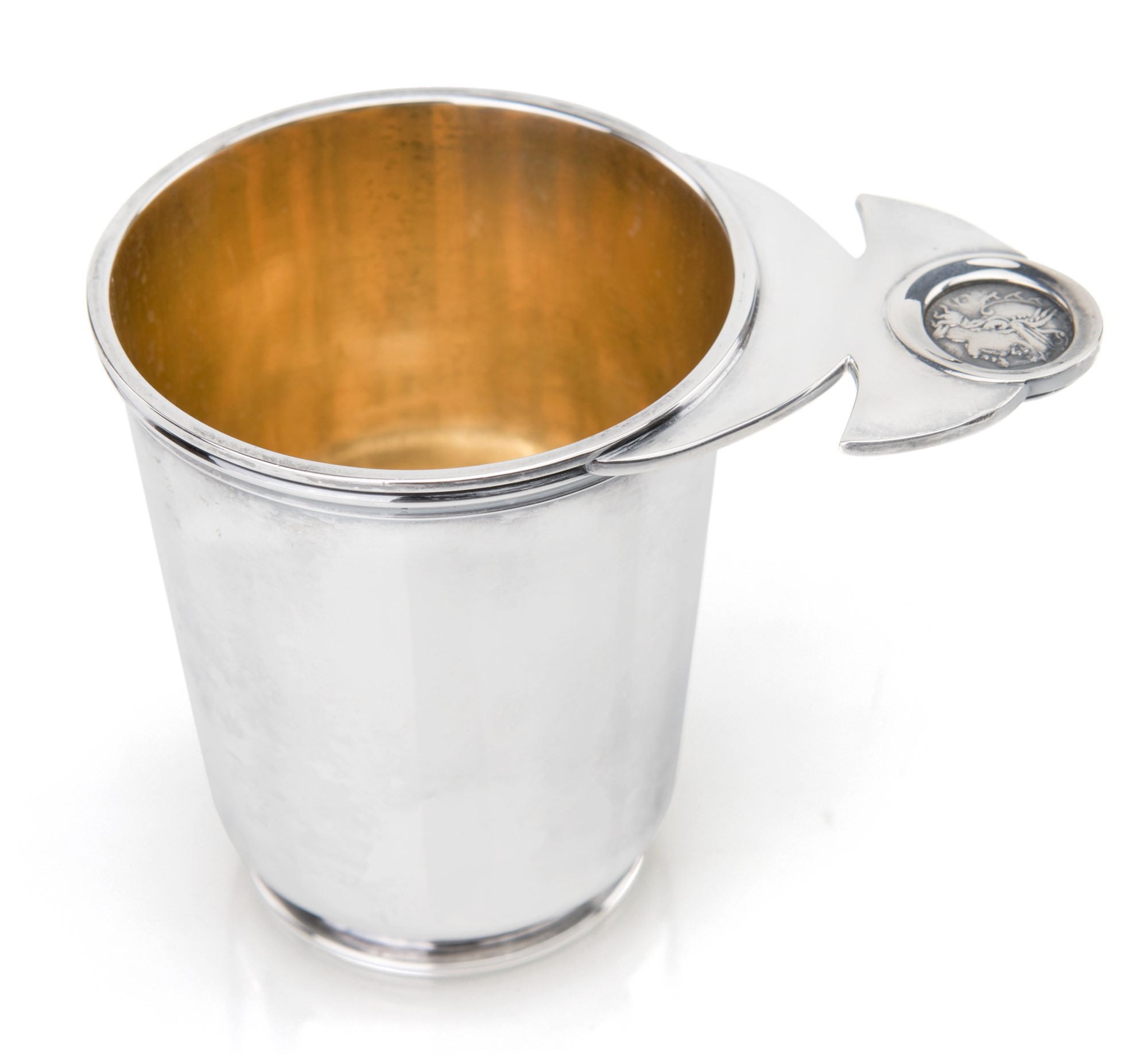 cm 8x10,5x7 - gr. 166 cm 8x10,5x7 - gr. 166 a superficie liscia con interno vermeil e basso piede ad anello, caratterizzato sul bordo da presa sagomata impreziosita da moneta antica