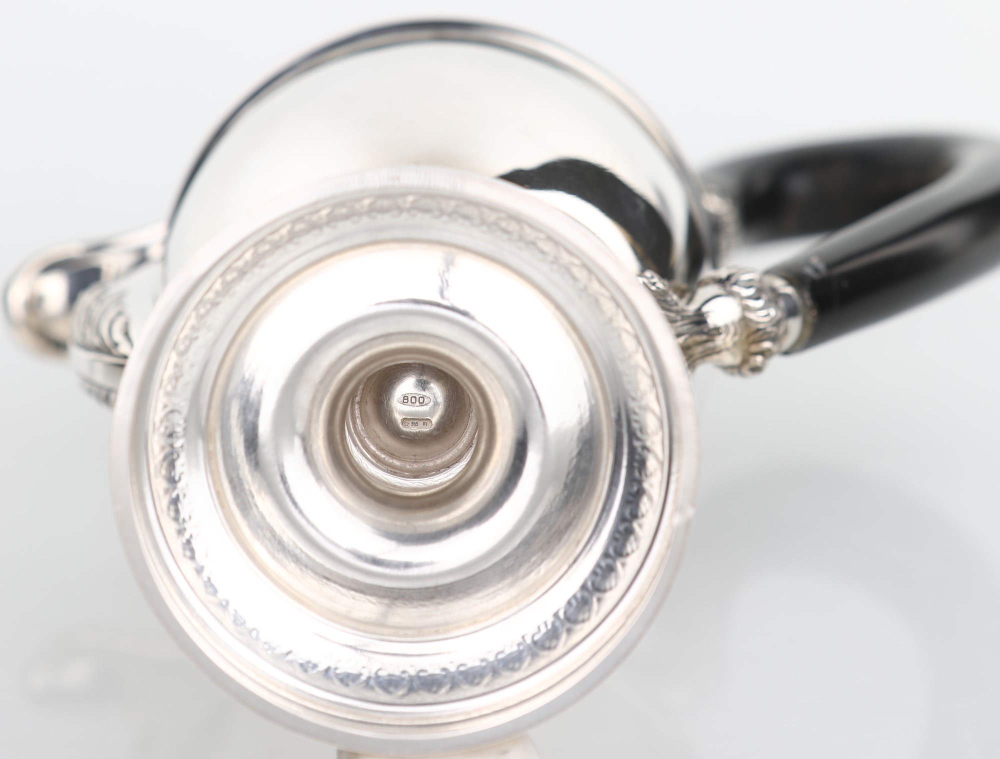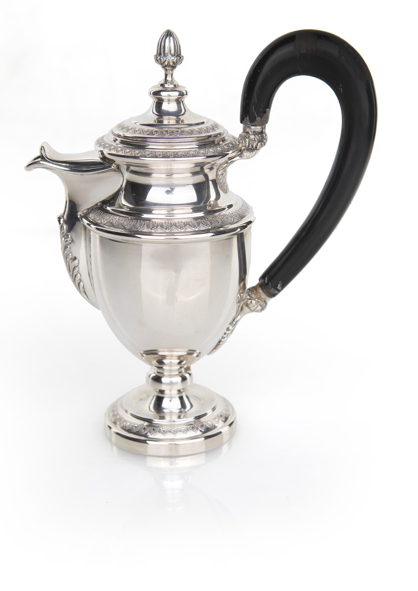 altezza cm 20 - gr. 398 altezza cm 20 - gr. 398 in stile Impero con corpo ad uovo su piede circolare, decorato da fasce cesellate e palmette; versatoio aderente sottolineato da lunga foglia in rilievo, coperchio sormontato da pignetta; bollo dell'argentiere 389