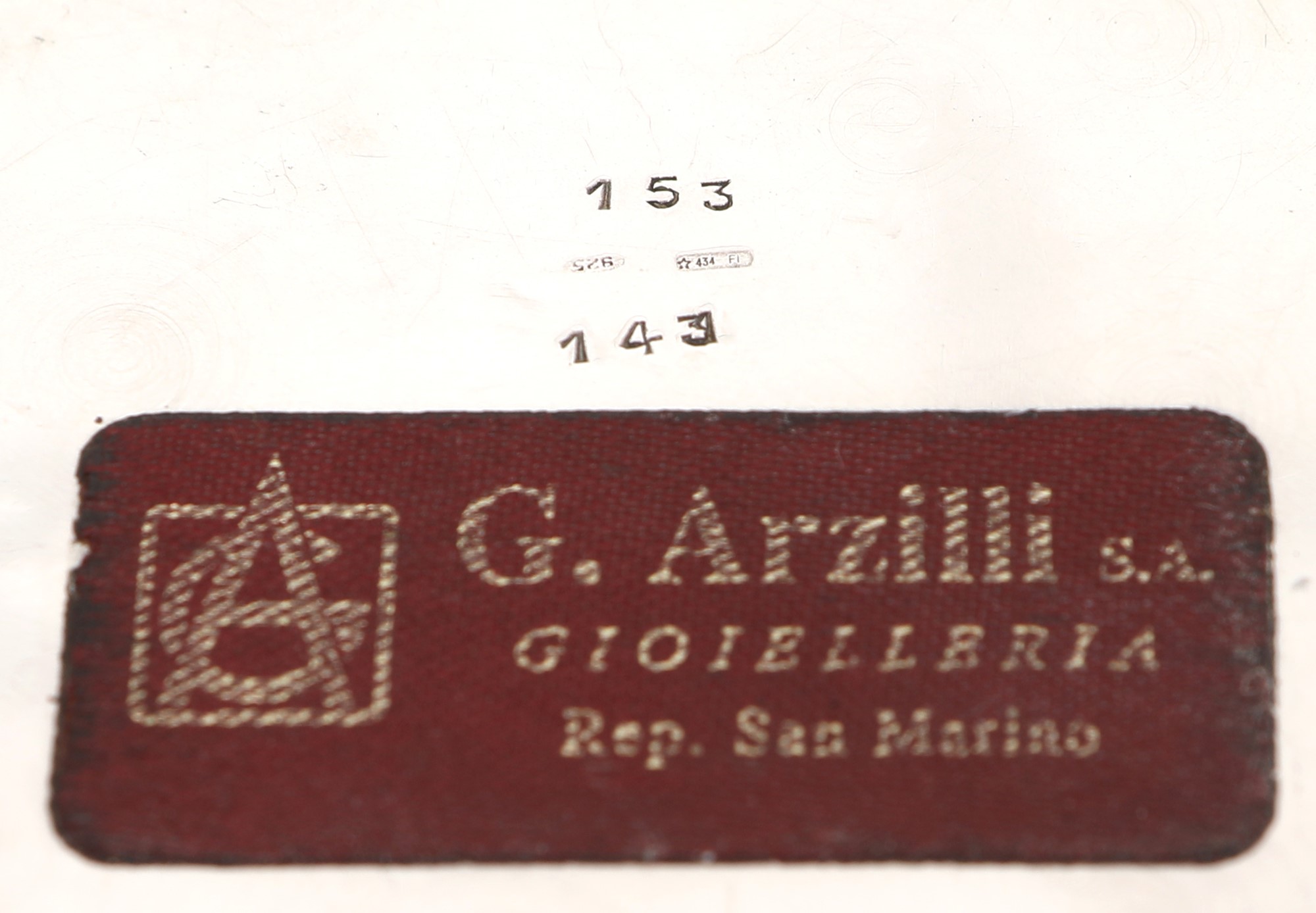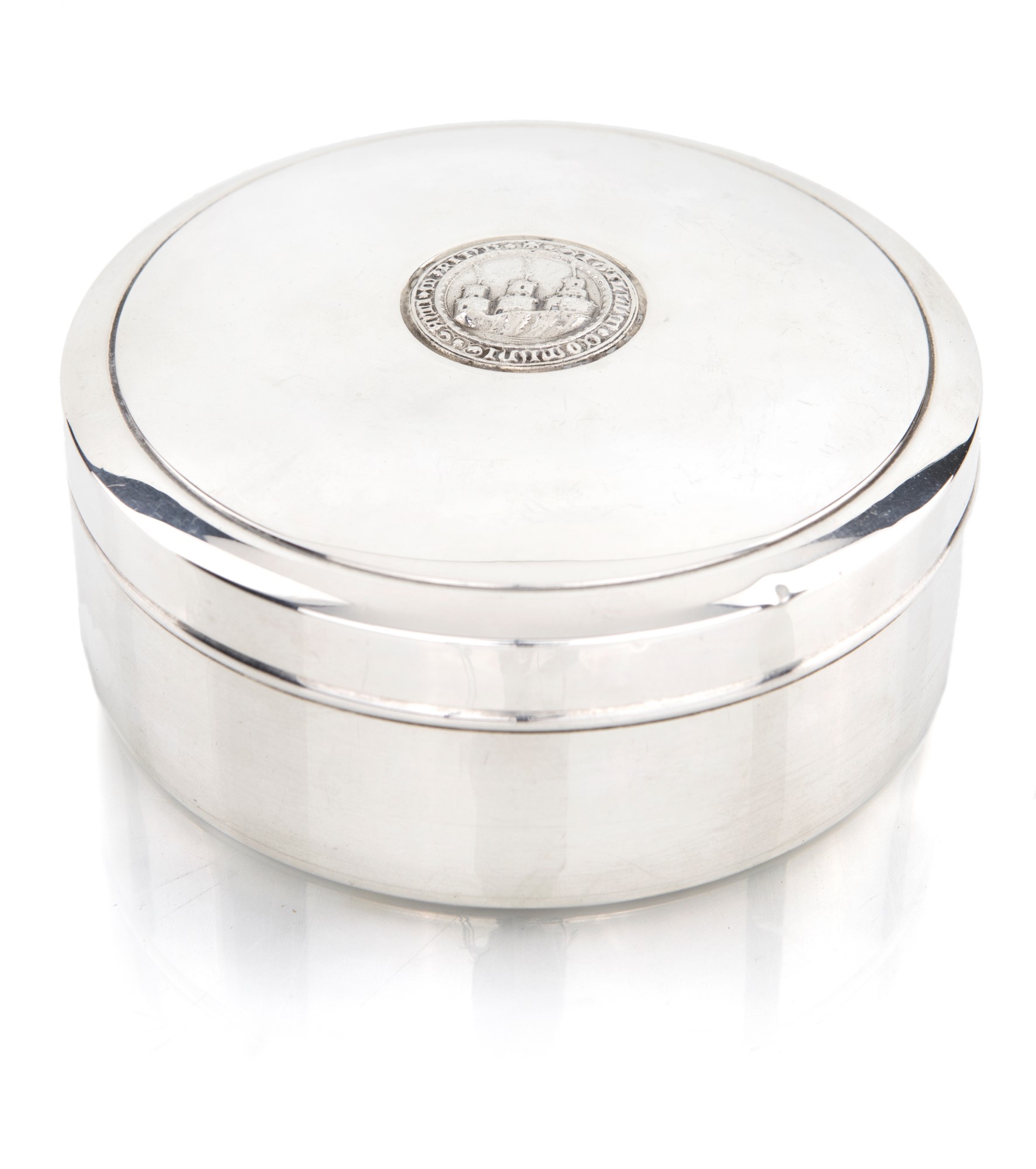 cm 4,5x12 - gr. 187 cm 4,5x12 - gr. 187 di forma circolare caratterizzata sul coperchio da un rilievo in forma di moneta con lo stemma di San Marino che raffigura il monte Titano con le tre rocche Cesta, Guaita e Montale. Reca etichetta della gioielleria G. Arzilli, Repubblica di San Marino