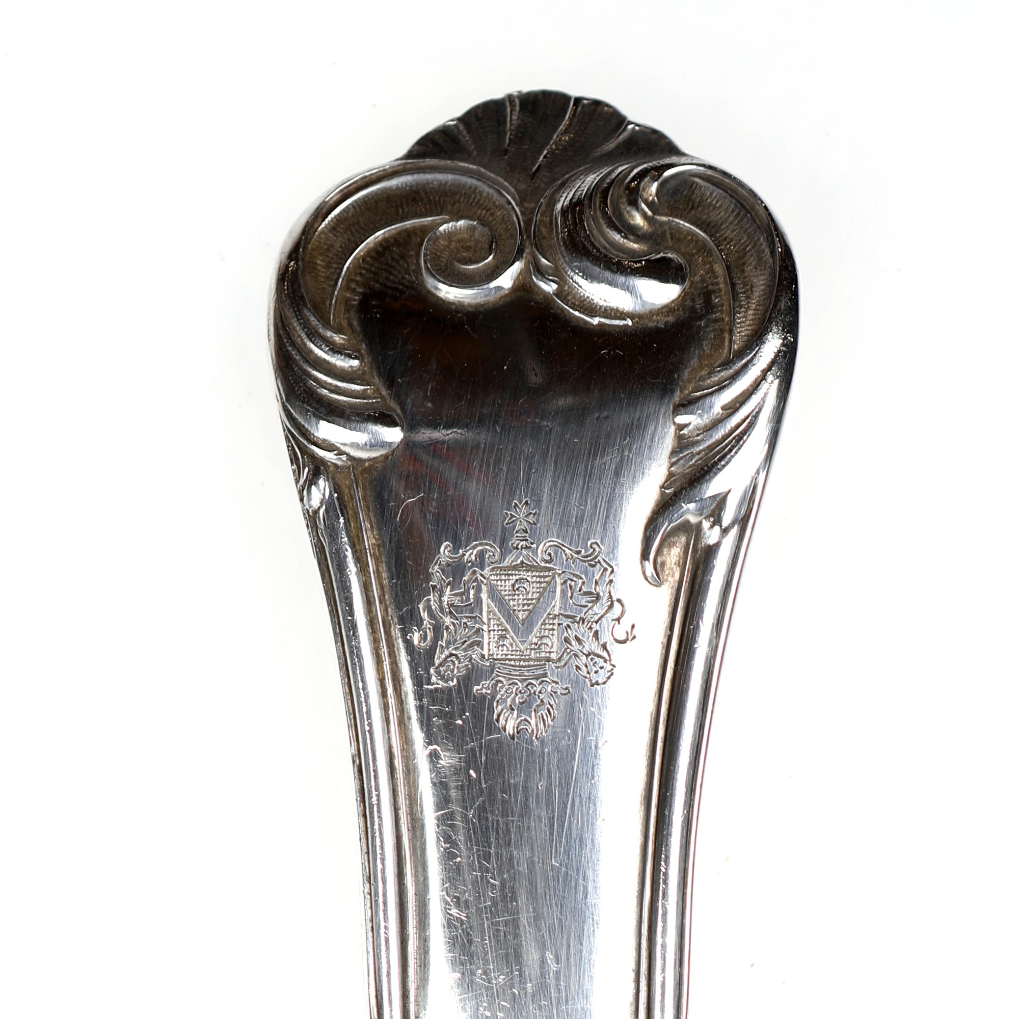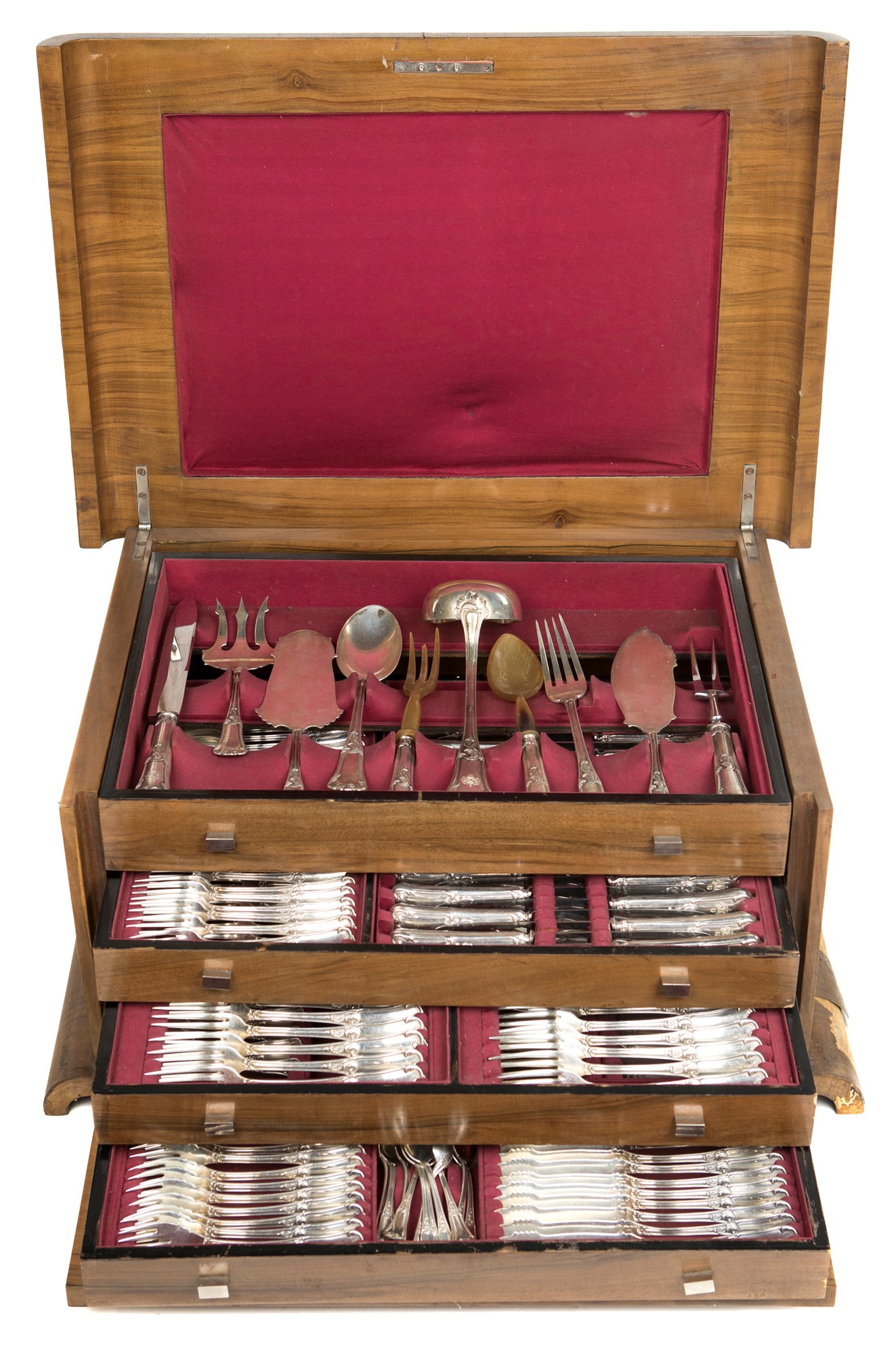gr. 7222 escluse alcune posate da portata e i coltelli (24 da pasto e dodici da frutta) - cassetta cm 32x66x45 gr. 7222 escluse alcune posate da portata e i coltelli (24 da pasto e dodici da frutta) - cassetta cm 32x66x45 caratterizzato da stemma della Famiglia Dusmet finemente inciso sulle impugnature, con ventiquattro forchette ed altrettanti coltelli da pasto; completo di posate da pesce, cucchiaini da caffè, tè e gelato, mestolo da salsa, coltello e forchetta da arrosto, forchettone, posate da insalata con paletta in corno, mestolo e due posate da dolce. Entro cassetta in noce