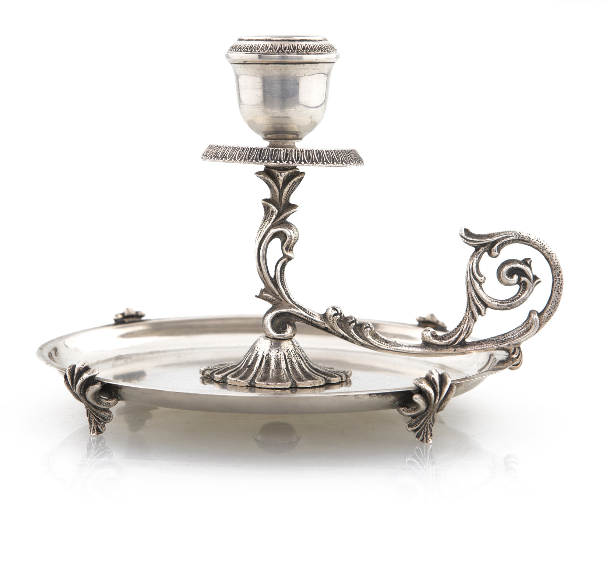 cm 12x17,5x11,5 - gr. 274 cm 12x17,5x11,5 - gr. 274 con piattino ovale sorretto da piedi in forma di foglia, centrato da portacandela emergente da uno stelo con estremità incurvata che funge da manico