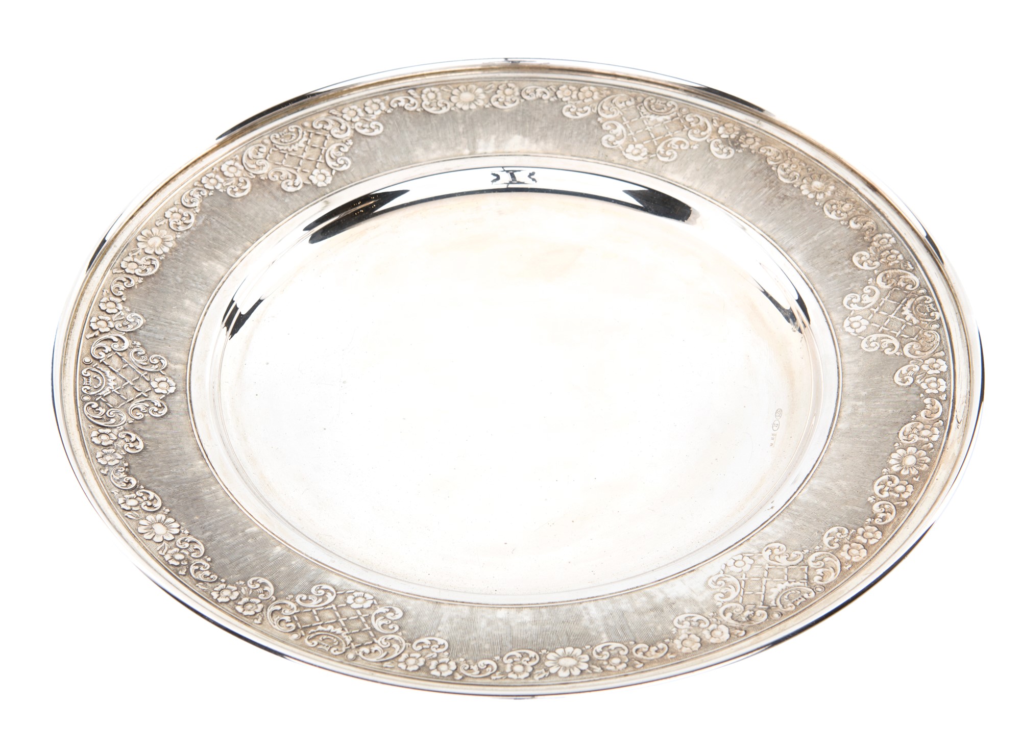 diametro cm 25,5 - gr. 454 diametro cm 25,5 - gr. 454 con tesa decorata da piccole corolle e volute vegetali emergenti su fondo satinato