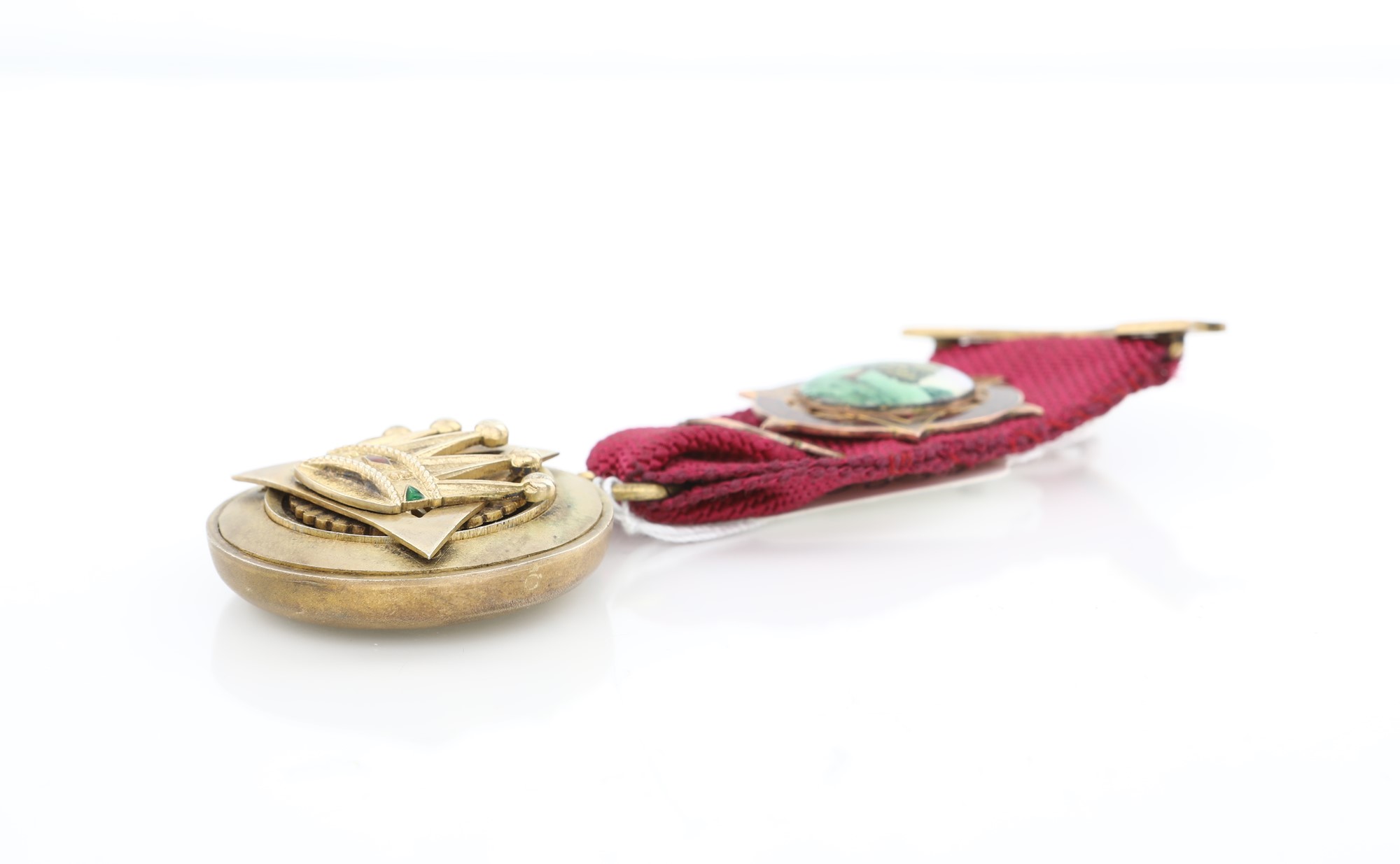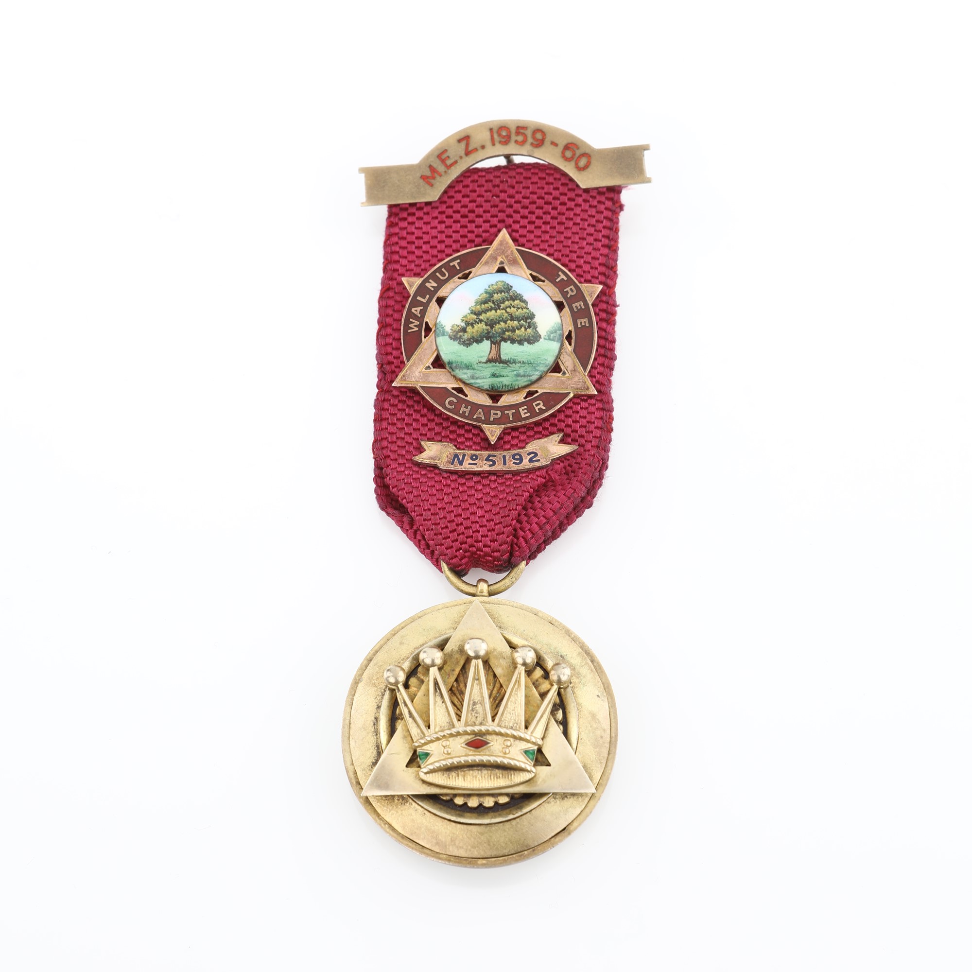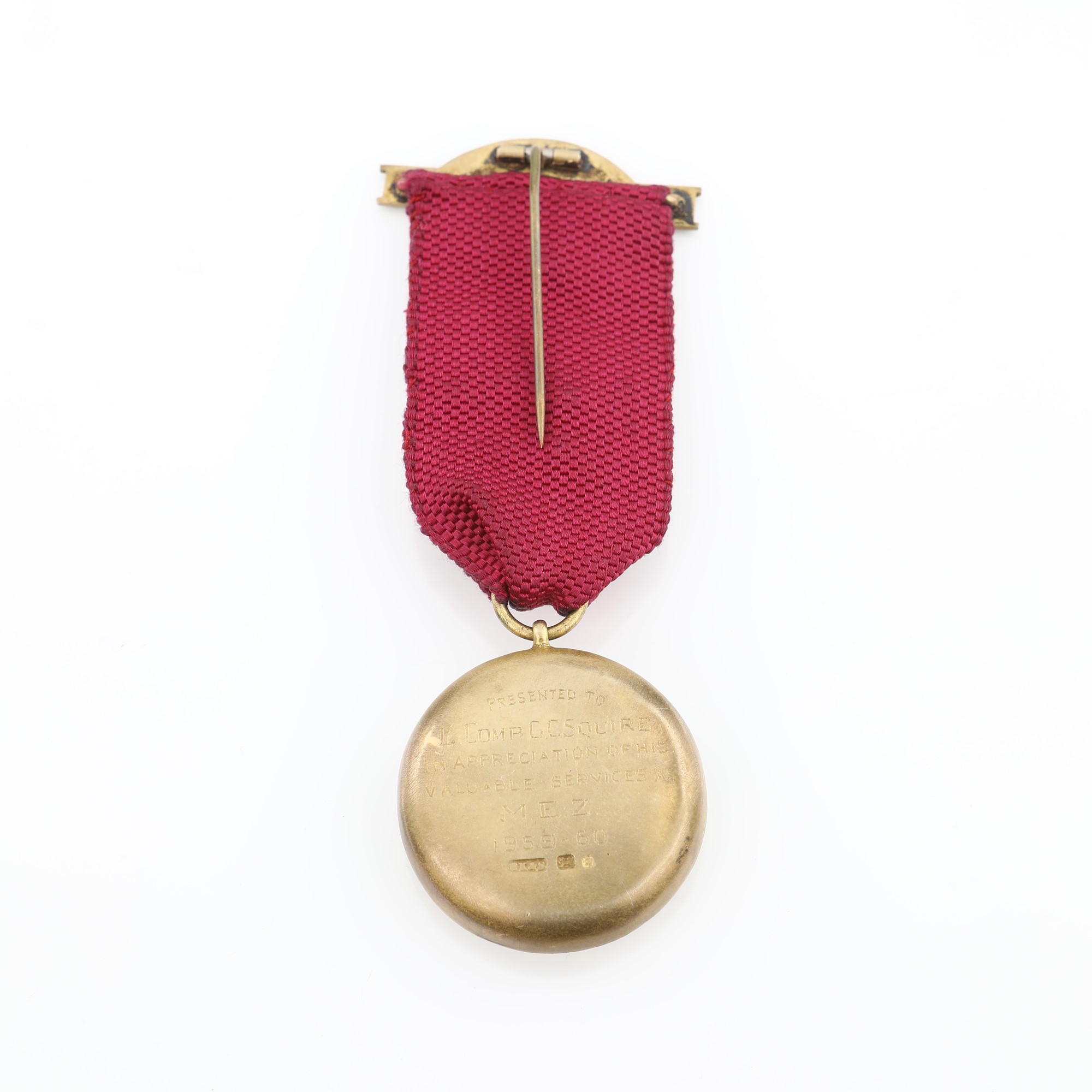 lunghezza con nastro: cm 10x3,5 - gr. 40 lunghezza con nastro: cm 10x3,5 - gr. 40 di forma con triangolo e corona con inserti in smalto; miniatura in smalti policromi con titolo sulla coccarda. Inciso al verso: presented to E. Comp. G.C. Squire in appreciation of his valuable services as M.E.Z. 1959 - 60. Bolli della città di Londra e dell'argentiere G.K. & son