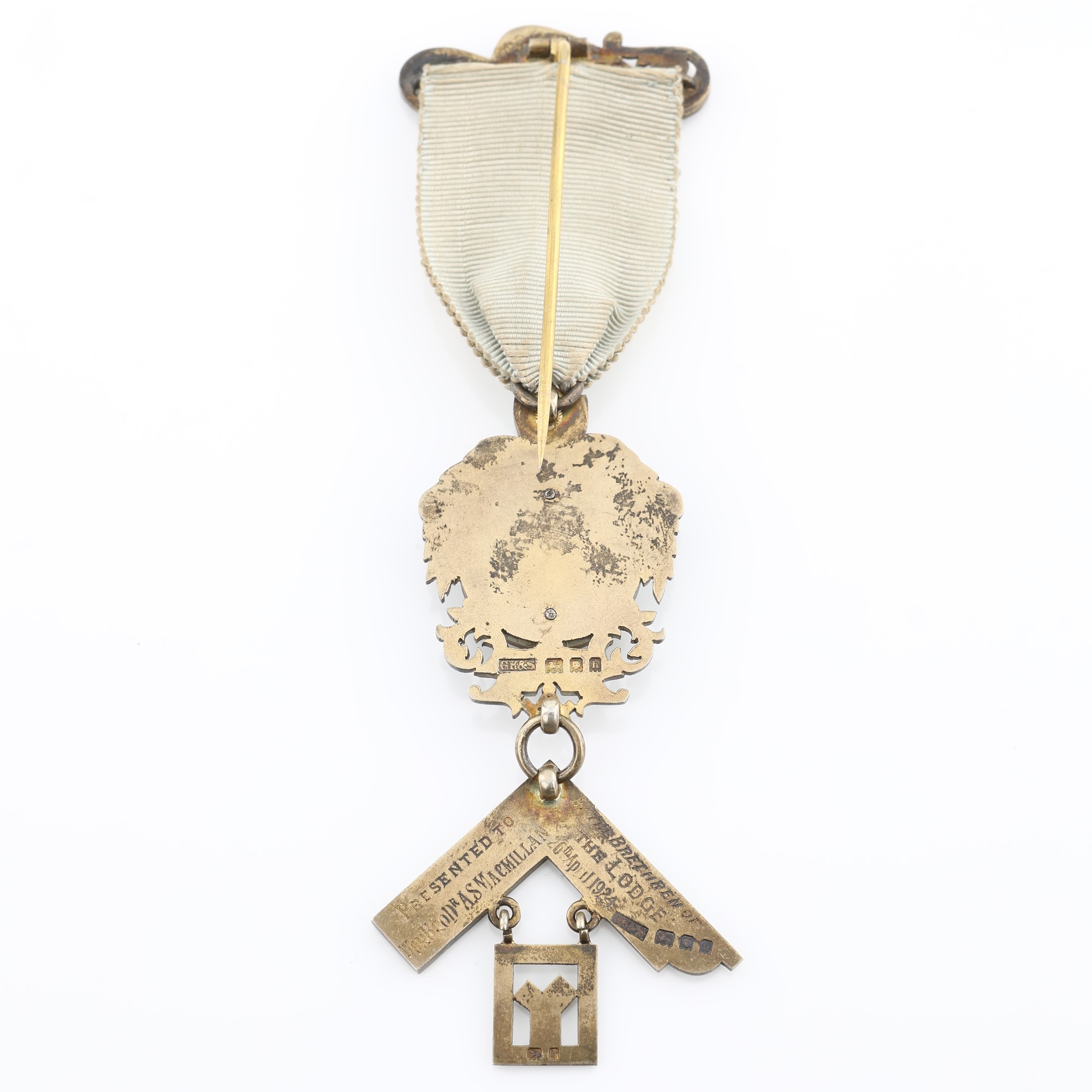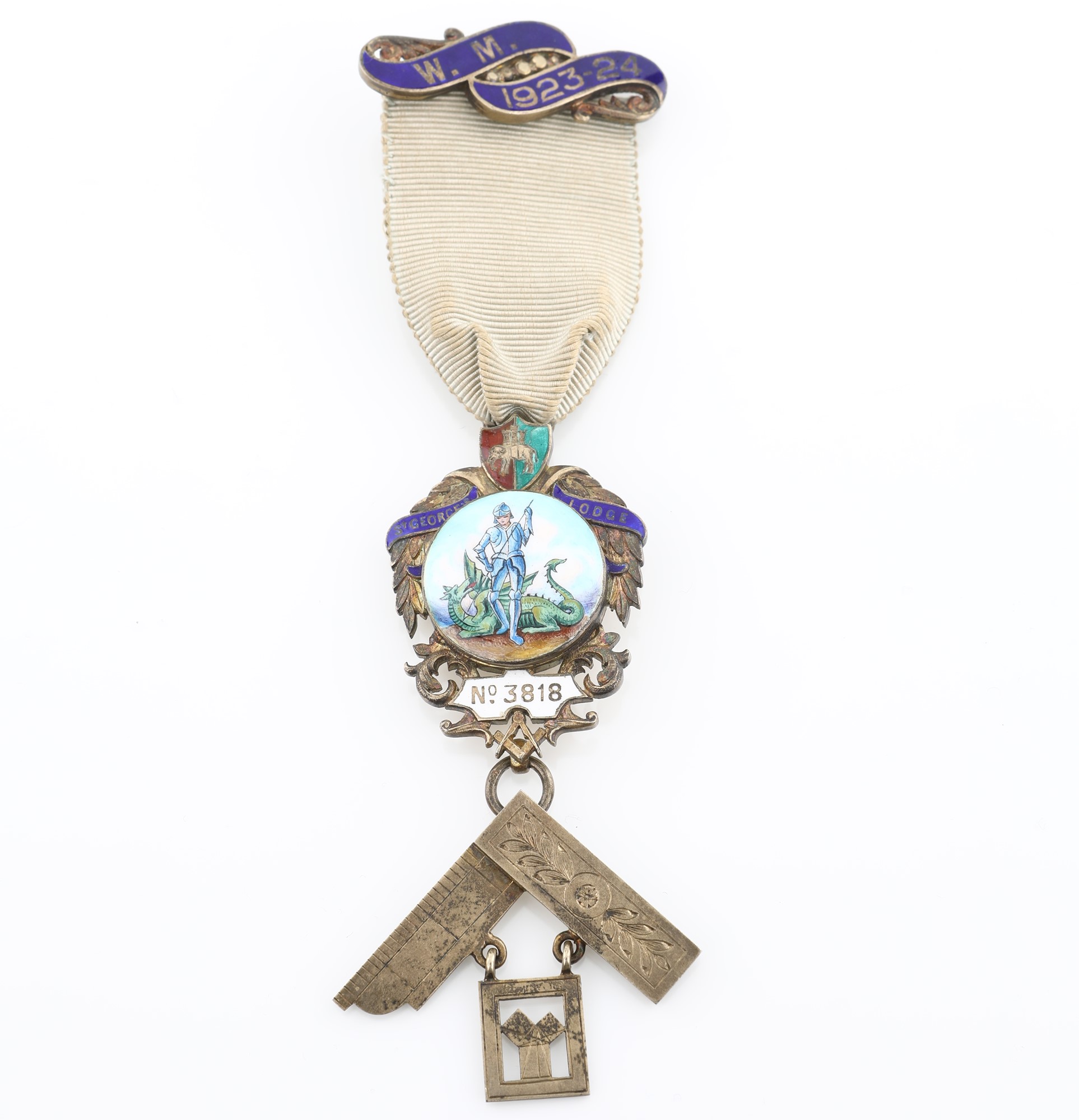 lunghezza con nastro cm 13 - gr. 44 lunghezza con nastro cm 13 - gr. 44 caratterizzata da miniatura con San Giorgio e il drago e da squadra con tabella pendente contenente teorema di Pitagora; sul nastro W.M. 1923 - 24. Inciso al verso: Presented to Wor.Bro. Dr. AS Macmillan by the Brethren of the Lodge 26th April 1924. Bollo della città di Londra con datario 1923-24 e dell'argentiere G.K. and son