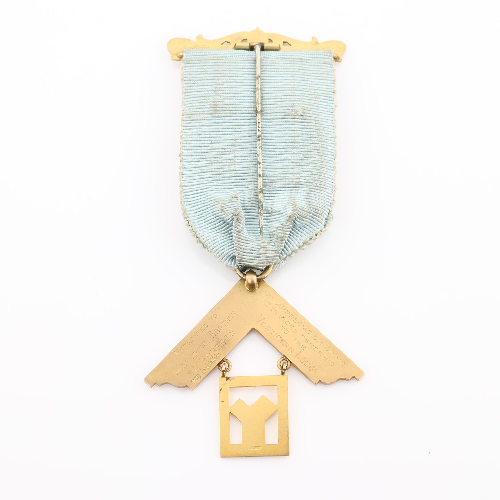 lunghezza con nastro cm 11 - gr. 34 lunghezza con nastro cm 11 - gr. 34 con miniatura raffigurante due personaggi e motto Auxilium Vincit Praesens Difficilia; squadra pensile e tabella con teorema di Pitagora, All'apice del nastro data W.M. 1954 su cartiglio in smalto. Inciso al verso: Presented to Worshipful Brother A. Roberts in appreciation of his Services rendered to the Vortigern Lodge. Bollo della città di Birmingham con datario 1932-33 e dell'orafo Spencer di Londra