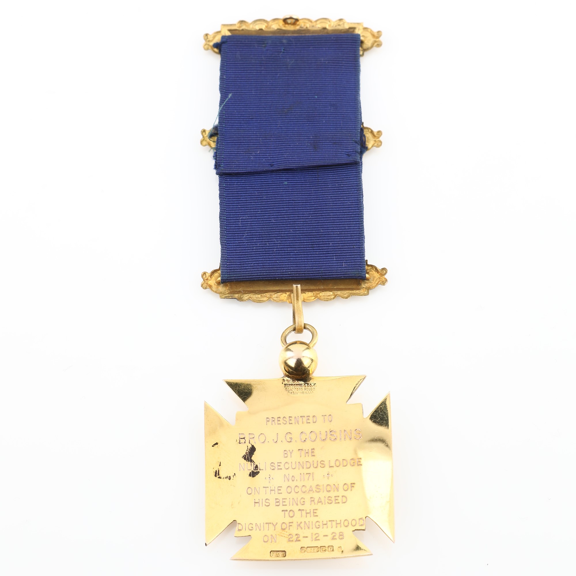 lunghezza con nastro cm 12,7 - gr. 28 lunghezza con nastro cm 12,7 - gr. 28 caratterizzato da testa di bufalo con occhi di gemme color rubino, motto Nemo Mortalium Omnibus Horis Sapit e iniziali G.C. Inciso al verso: Presented to Bro. J.G. Cousins by the Nulli Secundus Lodge n° 1171 on the occasion of his being raised to the dignity of Knighthood on 22.12.28. Sul nastro tre cartigli con date incise: 3.2.07, 28.4.10 e 22.12.28. Bollo della città di Birmingham con datario 1928-29 e dell'orafo Fattorini & sons, BradfordHouse. Piccola mancanza di smalto