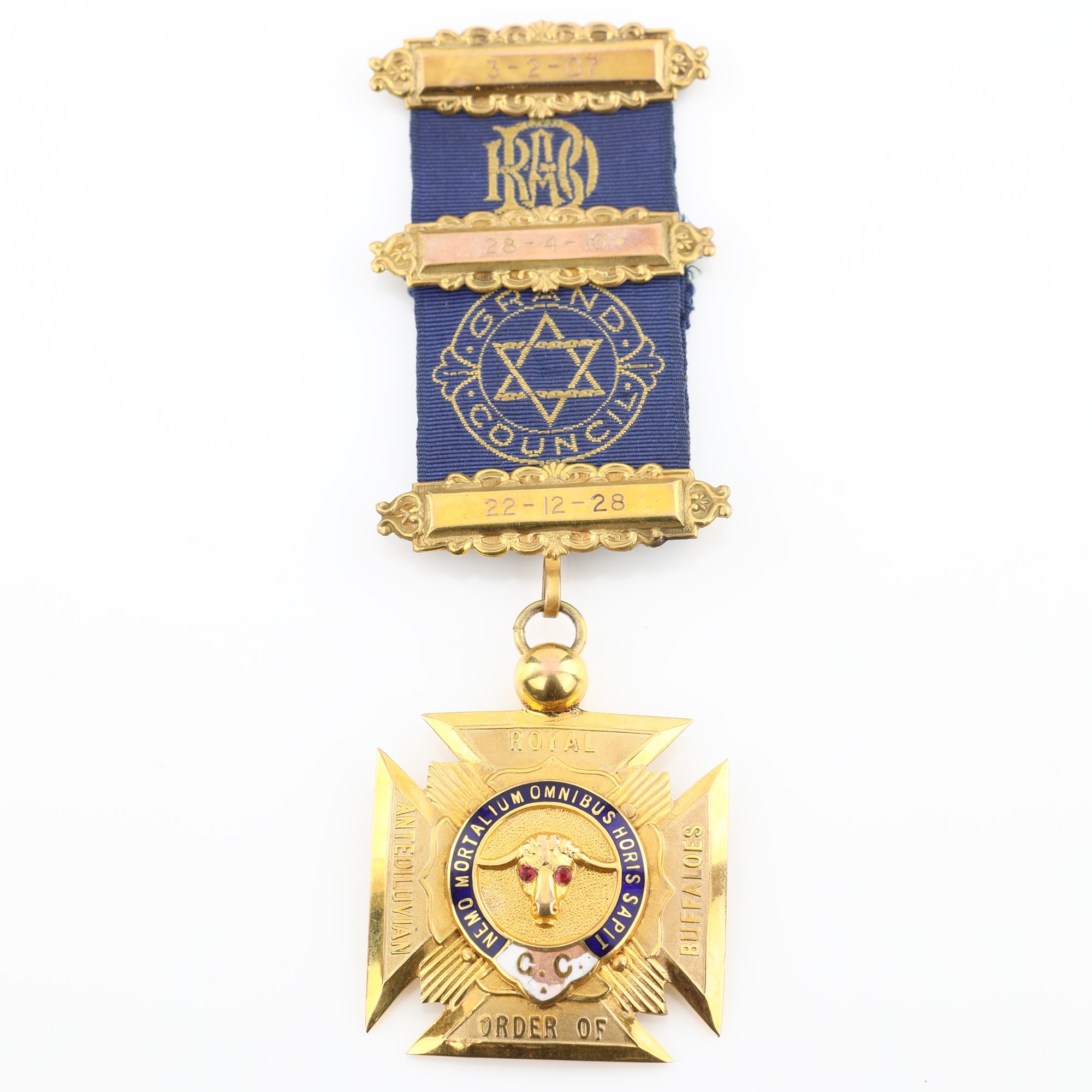 Distintivo con coccarda del Royal Antediluvian Order of Buffaloes in oro 9 kt e smalti