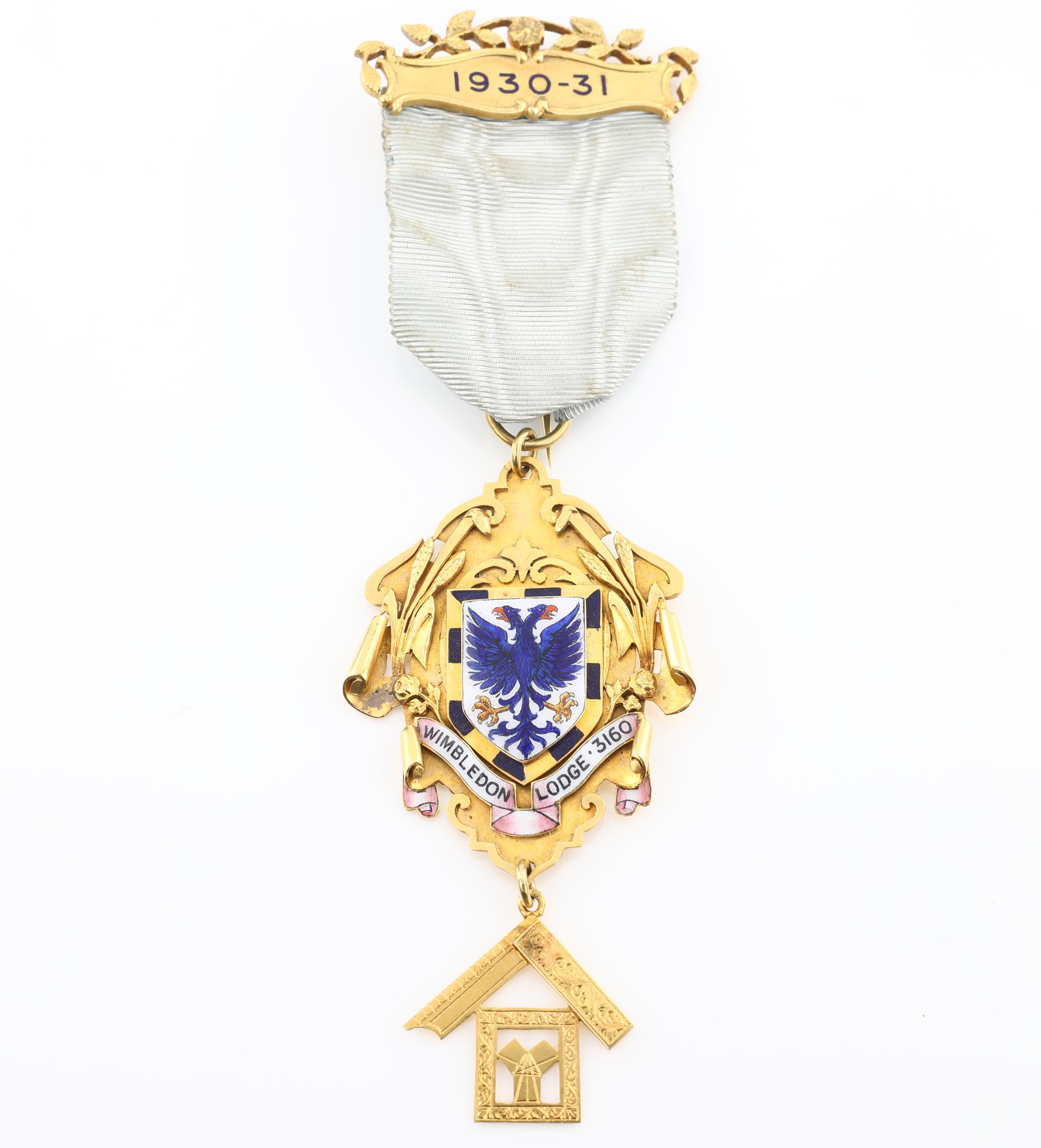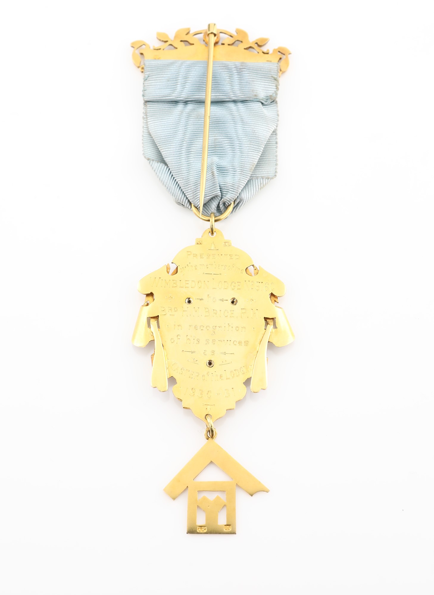 lunghezza con nastro cm 14 - gr. 36 lunghezza con nastro cm 14 - gr. 36 Inciso al verso: Presented by the members of the Wimbledon Lodge n° 3160 to Bro. H.M.Brice P.M. in recognition of his services as Master of the Lodge 1930-31. Bollo dell'argentiere I.P.