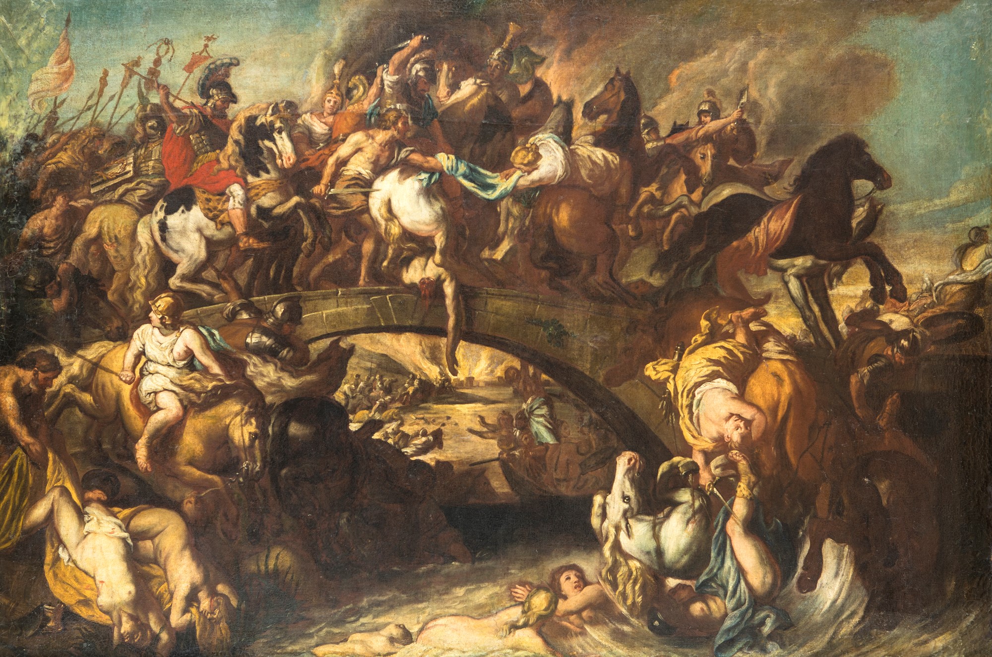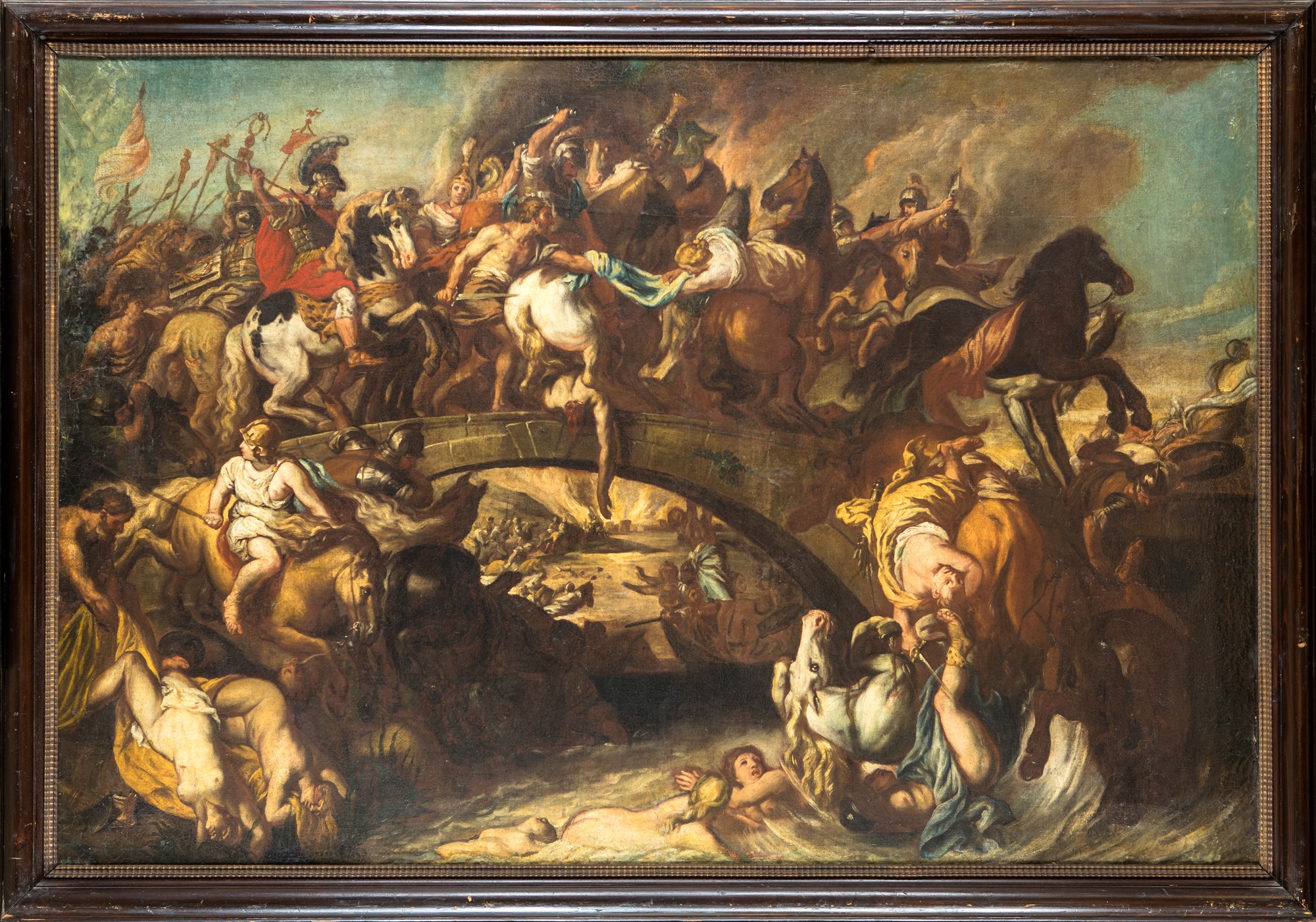 olio su tela cm 110x160 - in cornice: cm 125x176 Scuola Fiamminga del XVII secolo olio su tela cm 110x160 - in cornice: cm 125x176 La tela presenta una libera interpretazione seicentesca della celebre Battaglia delle Amazzoni attribuita a Pieter Paul Rubens e conservata presso la Alte Pinakothek di Monaco. La qualità della pennellata, la libertà dimostrata nel variare alcune scelte cromatiche, così come nel discostarsi da alcune soluzioni adottate nel modello di Monaco, suggeriscono di non essere in presenza di un pedissequo imitatore, bensì di trovarci davanti all'opera di un artista non privo di personalità e inventiva.