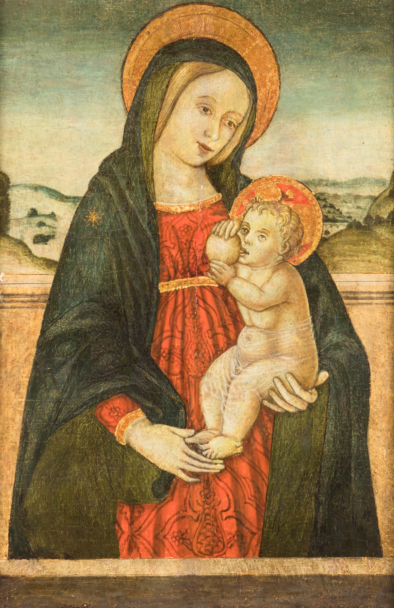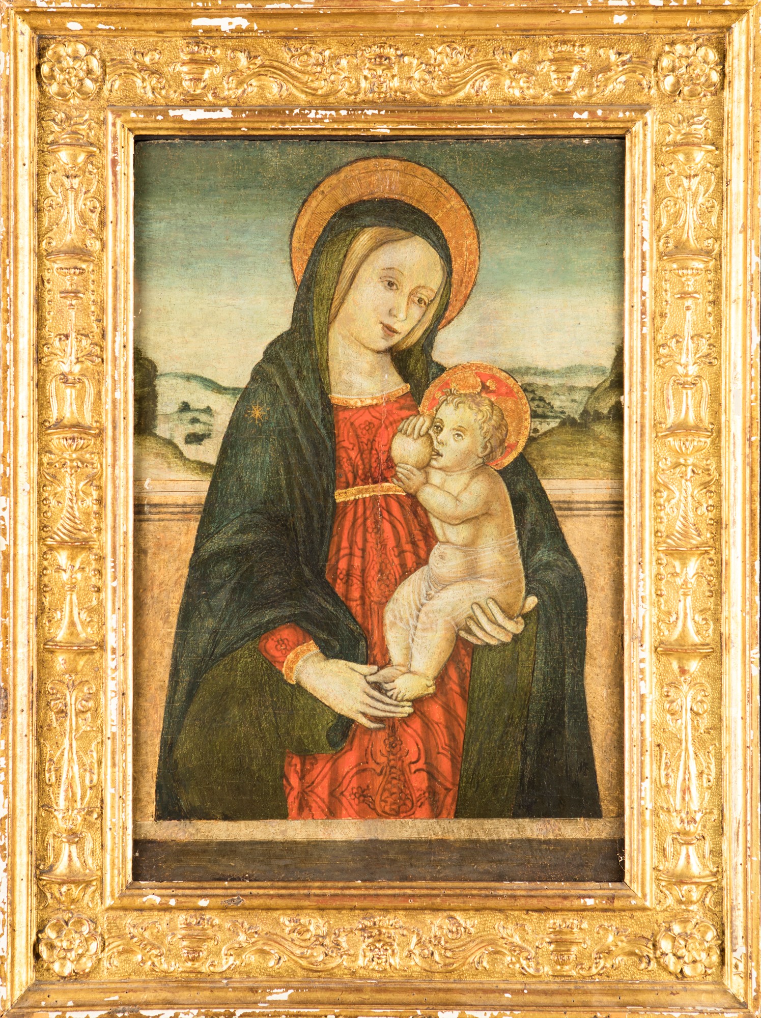 tempera su tavola cm 60x39 - con la cornice: cm 80x60 Pittore dell'Italia centrale del XV secolo tempera su tavola cm 60x39 - con la cornice: cm 80x60 La tavola, raffigurante la Madonna nell'atto di allattare il Bambino secondo la consueta iconografia che viene definita "del Latte" o "galactotrofusa", può essere ricondotta all'ambiente della pittura centro-italiana della prima metà del XVI secolo.