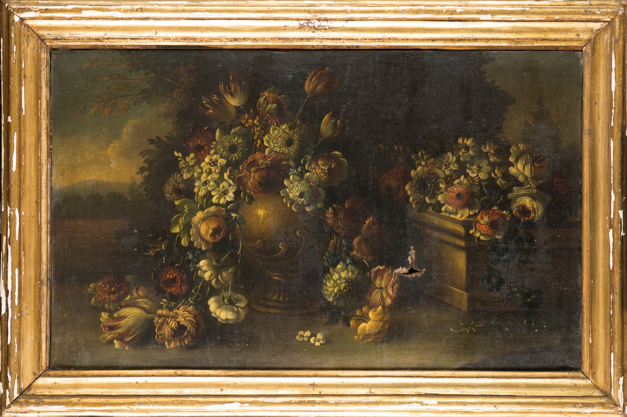 olio su tela cm 59x96 - in cornice: cm 76x115 Scuola Romana del XVII secolo (1:Principale) olio su tela cm 59x96 - in cornice: cm 76x115 Raffinata natura morta con due assembramenti di fiori raccolti in un vaso in bronzo e in una vasca in terracotta. La sofisticata attenzione riposta negli effetti della luce, che rimbalza sulle diverse superficie assumendo aspetti sempre diversi, e l'uso di colori dai toni metallici, suggeriscono la mano di un abile pittore fiammingo attivo a Roma nella seconda metà del XVII secolo.