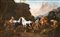 olio su tela cm 96x159 - in cornice: cm 113x174 Scuola Romana del XVIII secolo olio su tela cm 96x159 - in cornice: cm 113x174 Il dipinto raffigura l'episodio mitologico del furto delle giovenche di Apollo da parte di Ermes. Quest'ultimo, dopo aver comprato il suo silenzio, porta gli animali rubati sul monte Menalo, sotto la supervisione del pastore Batto, che successivamente subirà l'ira di Ermes per essere venuto meno ai patti stabiliti. L'episodio diventa qui un espediente per eseguire una piacevole rappresentazione del paesaggio montano, mentre le figure, non prive di una certa ironia, sono ancora seicentesche nella pennellata